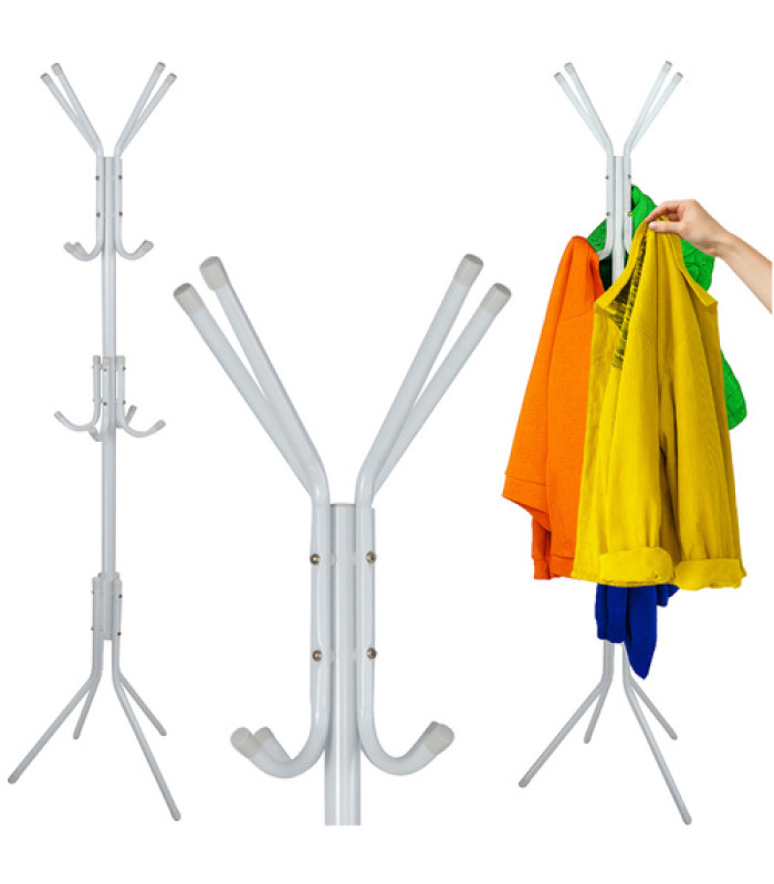 Seisev riidepuu riiete ja jakkide jaoks, stabiilne valge metallist põrandapuu 4 jalaga RUHHY - praktiline lahendus igasse interjööri