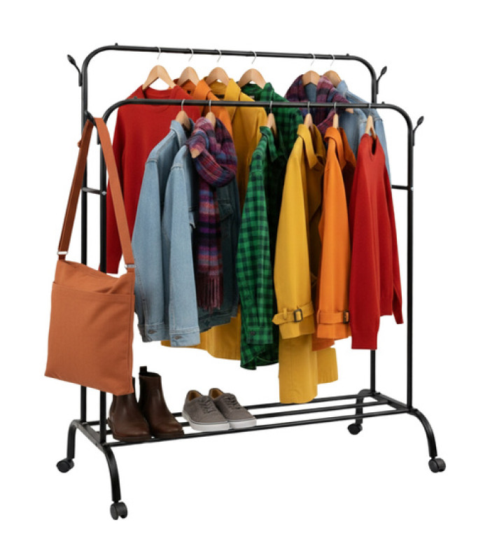 Kas oled väsinud segadusest ja hommikusest kaosest? Ruhhy ratastel riidenagi - nagi, mis lõpuks korrastab sinu ruumi, topeltnagi, riiuli ja konksudega.