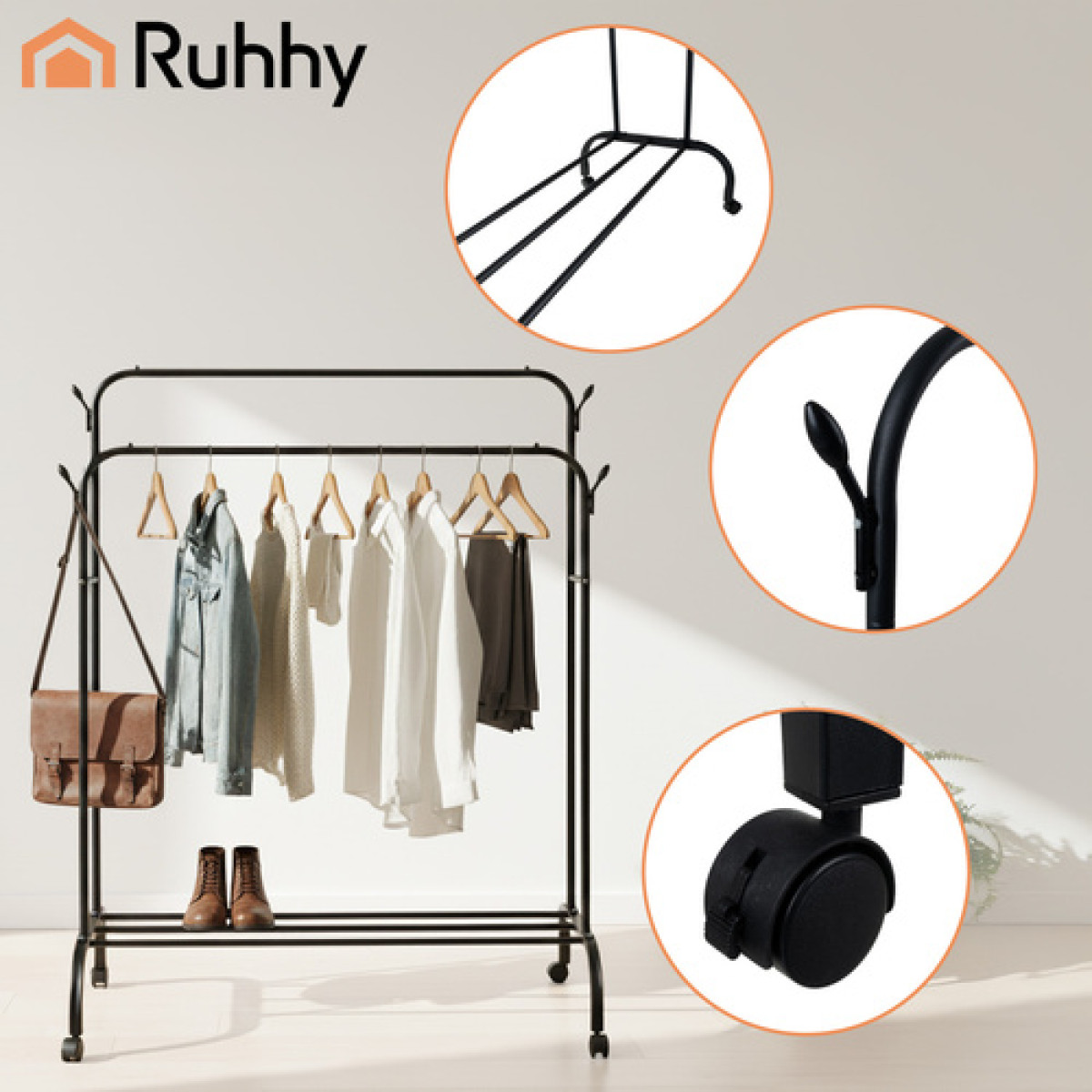 Otsid nutikat viisi garderoobi, esiku või kontori korrastamiseks? Topelt Ruhhy riidenagi pakub suurt ruumi riiete ja aksessuaaride jaoks ning tänu lukustatavale ratastele saad seda hõlpsasti liigutada sinna, kus seda parajasti vajad. Tugev konstruktsioon rauast raamiga ja praktilise alumise riiuliga tagab, et riided on alati käepärast ja ideaalses seisukorras.
