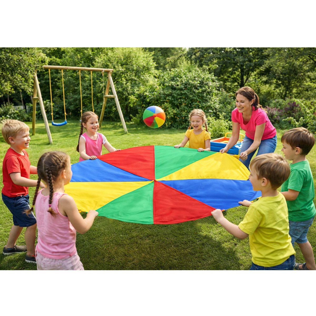 2-meetrise läbimõõduga mänguriidel on 8 mugavat käepidet, mis teevad selle sobivaks ühisteks mängudeks suuremas seltskonnas. Erksad vikerkaarevärvid köidavad tähelepanu ja innustavad lapsi aktiivselt liikuma.