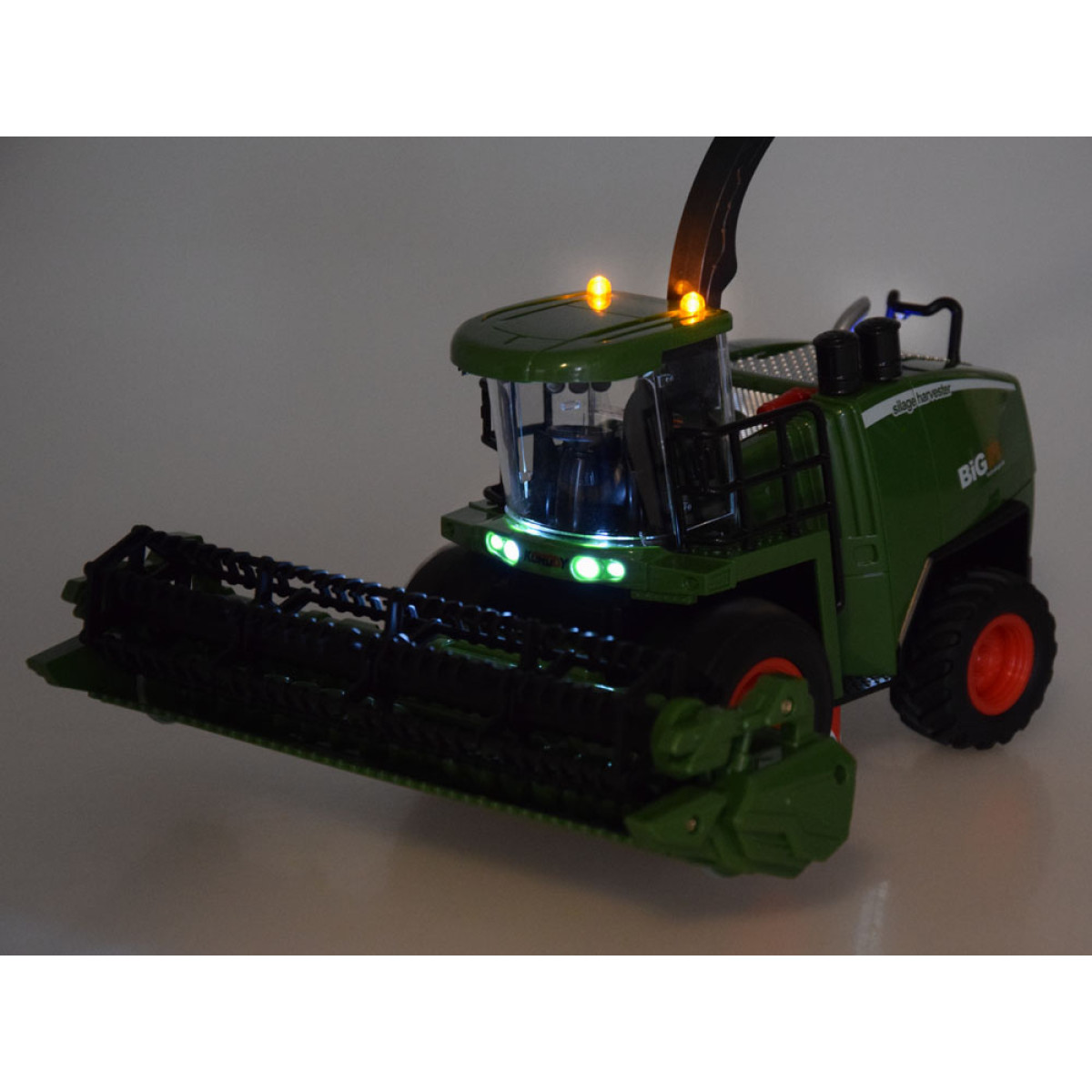 Kombaini käivitamisel kuulete mootori käivitamise ja töötamise heli madalatel pööretel. Edasisõidul kuulete mootori tööd ja esituled süttivad, samuti katusetuli. Tagasisuunas sõites kuulete tagurdamise heli ja tuled hakkavad vilkuma. Valgus- ja heliefekte saab puldiga välja lülitada.