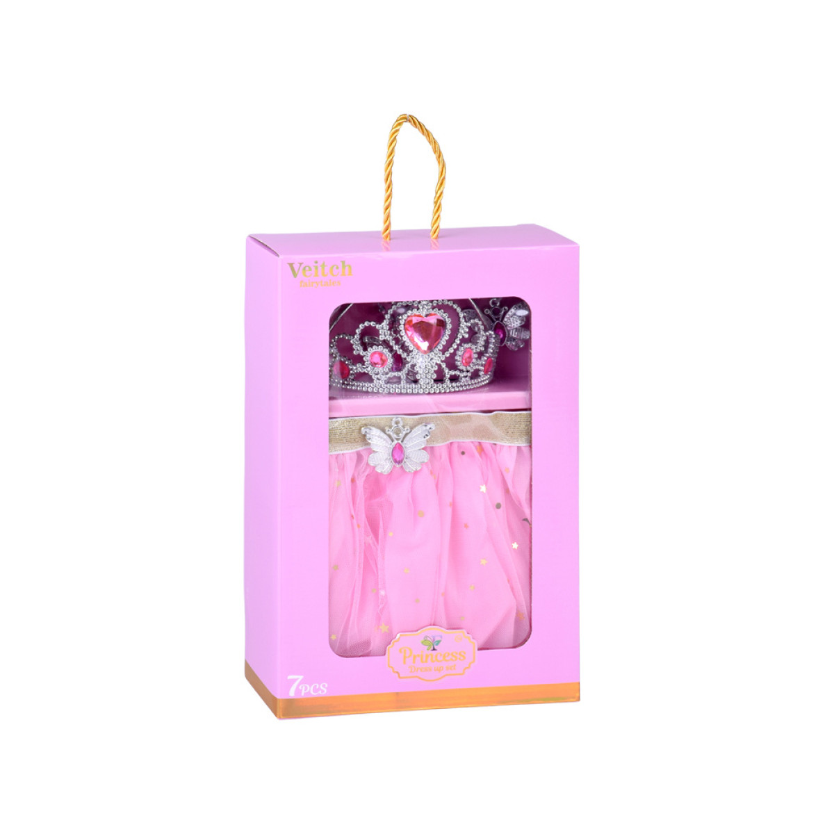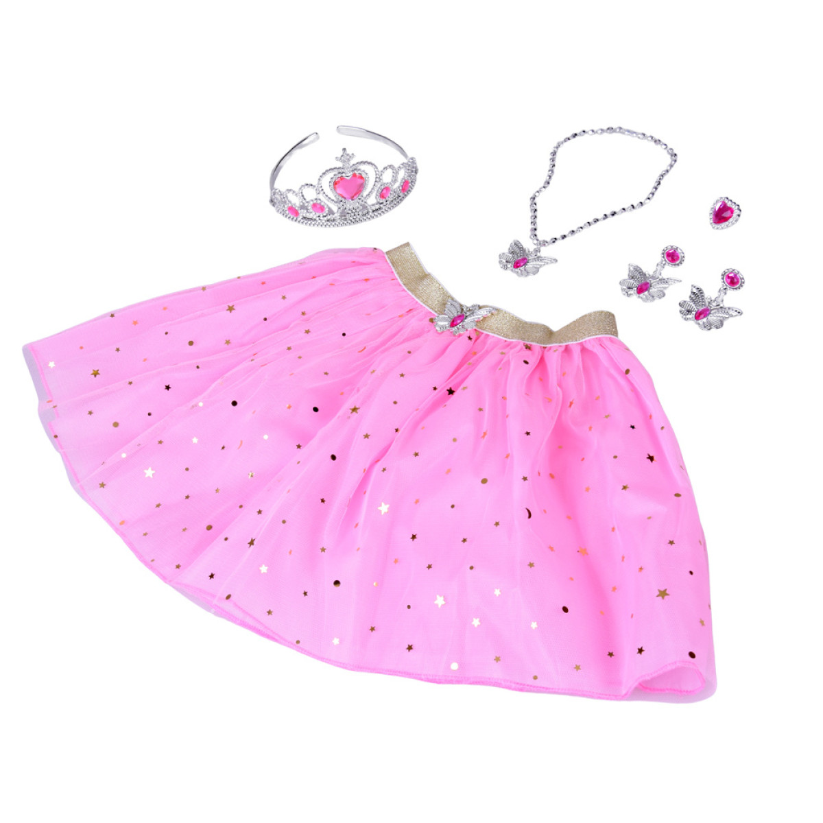 Kogu komplekti täiendab ehted – hõbedane kroon roosade kristallidega, sobivad paar kõrvarõngaid (klipsid) – liblikad, kaelakee ning sõrmus, mille legend räägib, et see täidab unistusi. Kõik elemendid moodustavad ühtse motiivi – haldja südame sümbol, mis on täis sära.