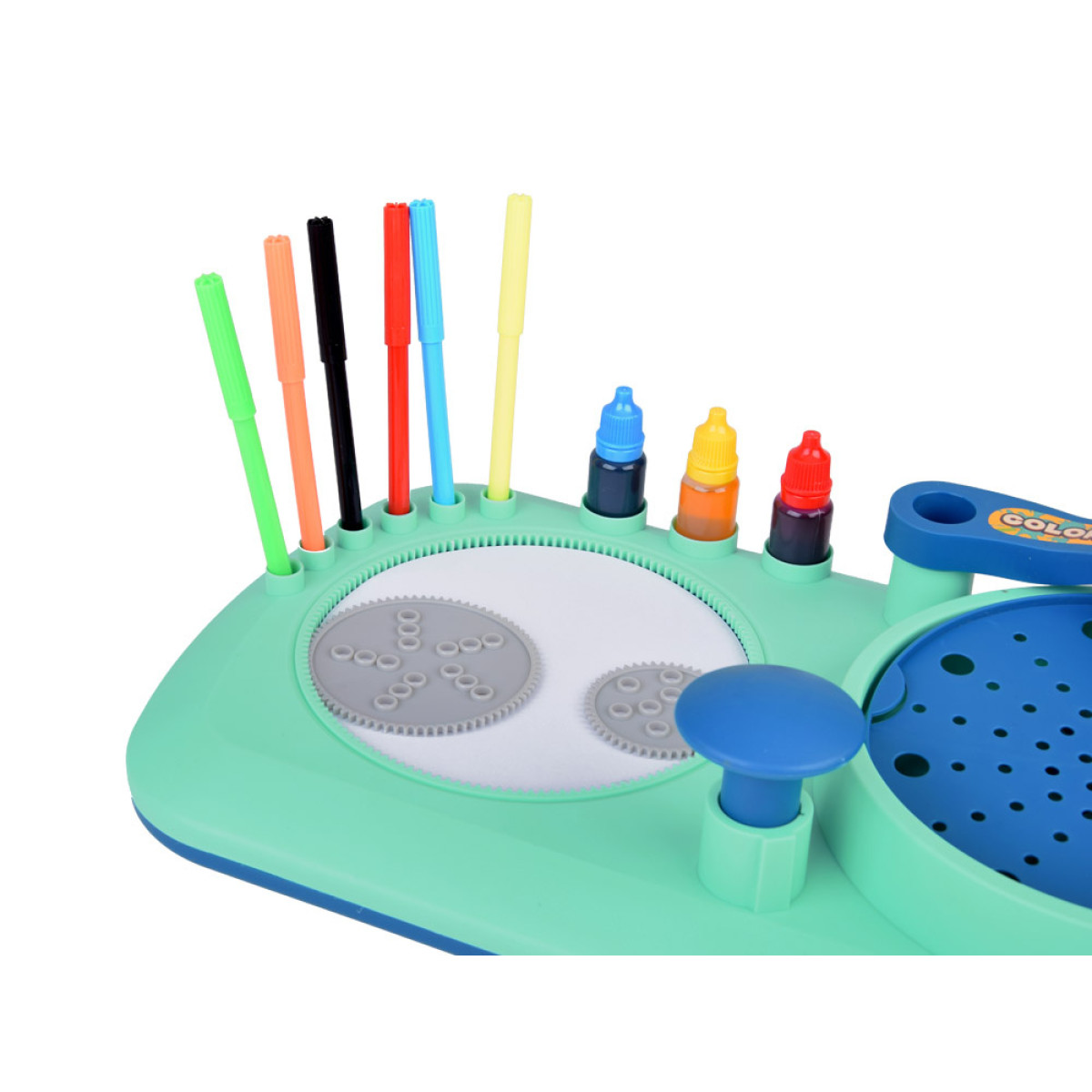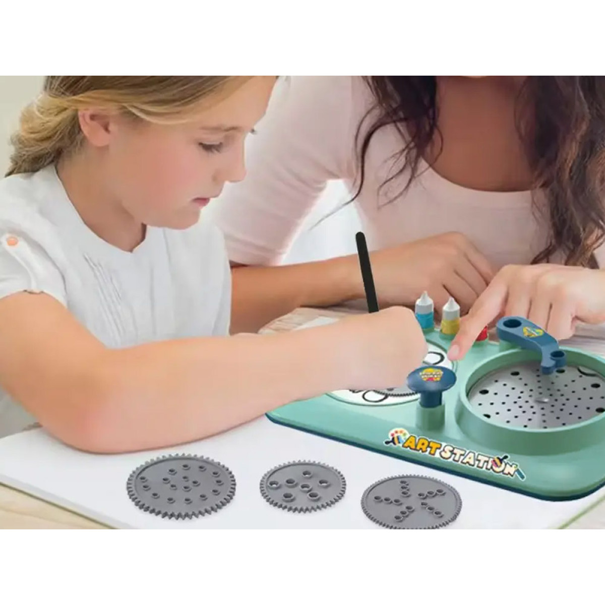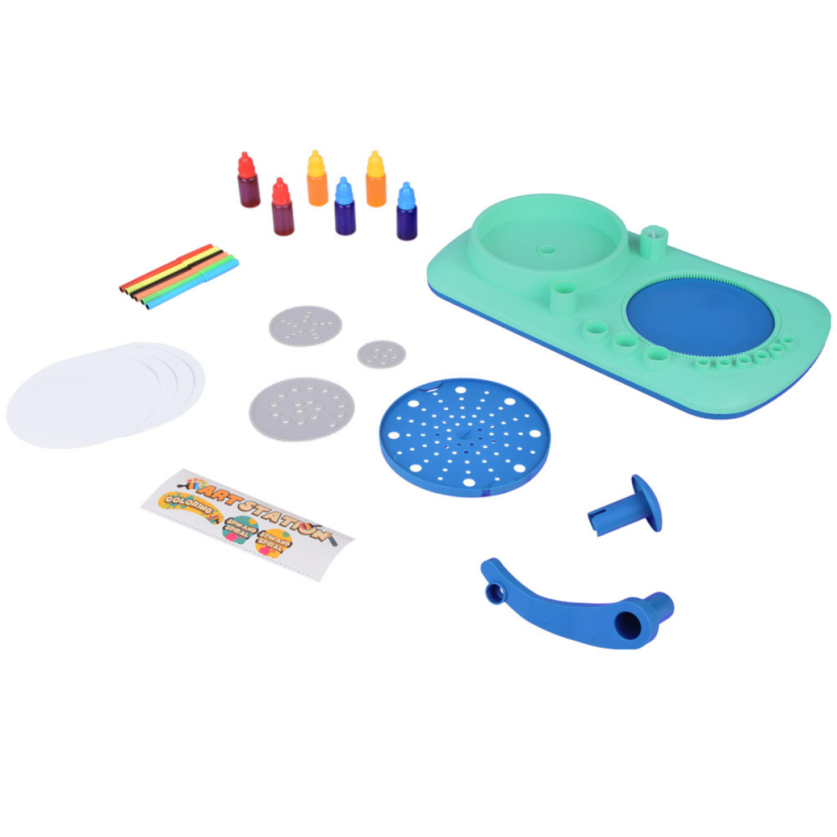 49 osa – kõik, mida on vaja loominguliseks mängimiseks, sealhulgas värvilised markerid, värvid, pöörlev maalimisplatvorm ja spirograafi šabloonid. Funktsioonid: Pöörlev platvorm võimaldab luua unikaalseid mustreid värvide või markerite abil – lihtsalt vajuta nuppu, et mehhanism käivitada. Mänguasi ei vaja patareisid.