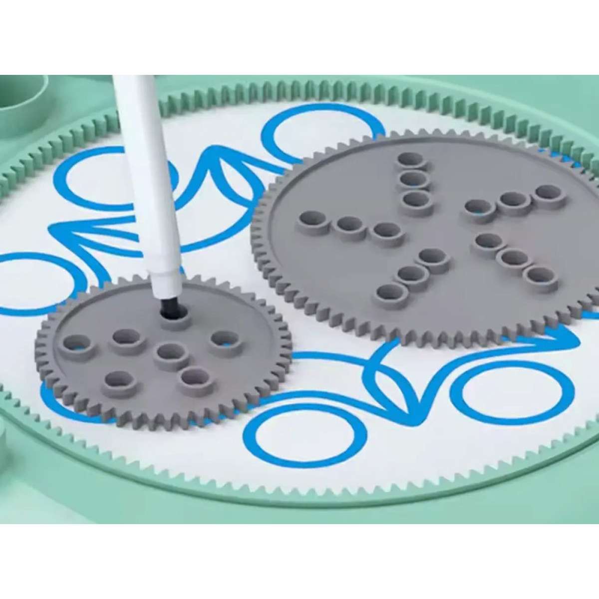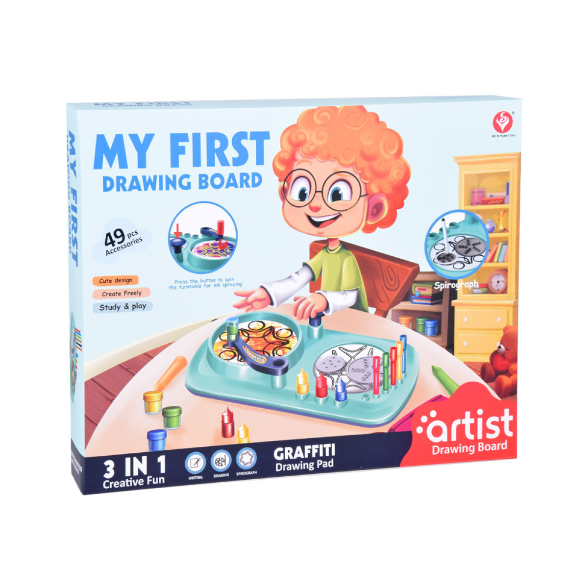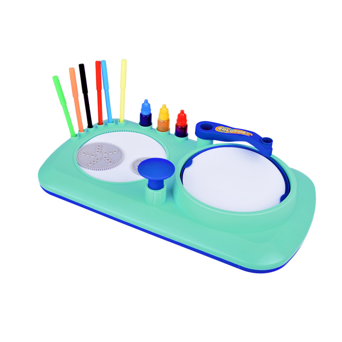 49 osa – kõik, mida on vaja loominguliseks mängimiseks, sealhulgas värvilised markerid, värvid, pöörlev maalimisplatvorm ja spirograafi šabloonid. Funktsioonid: Pöörlev platvorm võimaldab luua unikaalseid mustreid värvide või markerite abil – lihtsalt vajuta nuppu, et mehhanism käivitada. Mänguasi ei vaja patareisid.