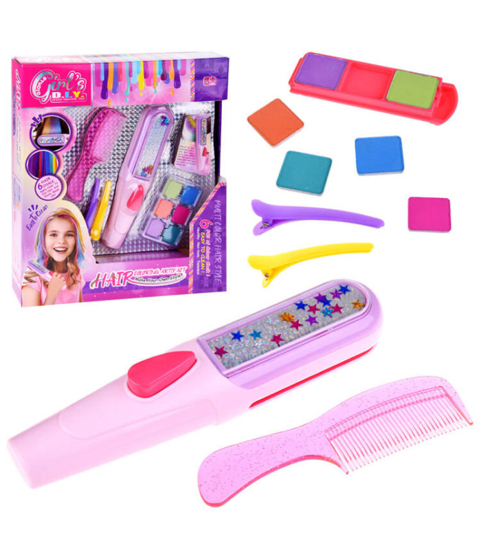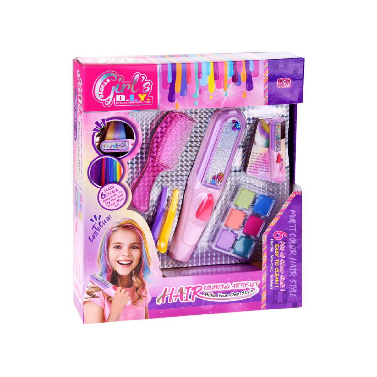 Komplekt sisaldab kõiki vajalikke tarvikuid, millega saab luua uue värvilise soengu. Komplektis on 6 erinevat värvi kriiti: lilla, oranž, roheline, türkiis, roosa, sinine; lisaks kamm ja värvi pealekandmise seade.