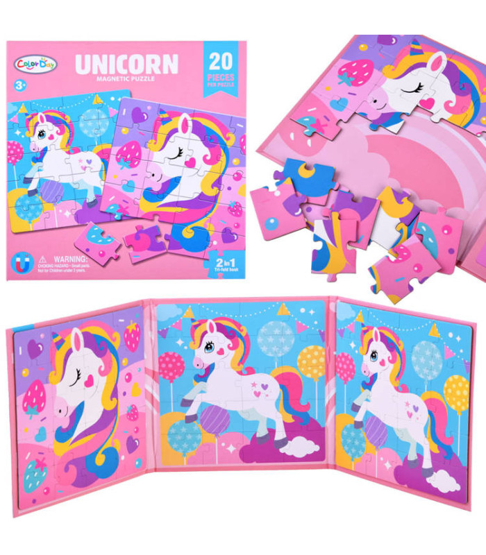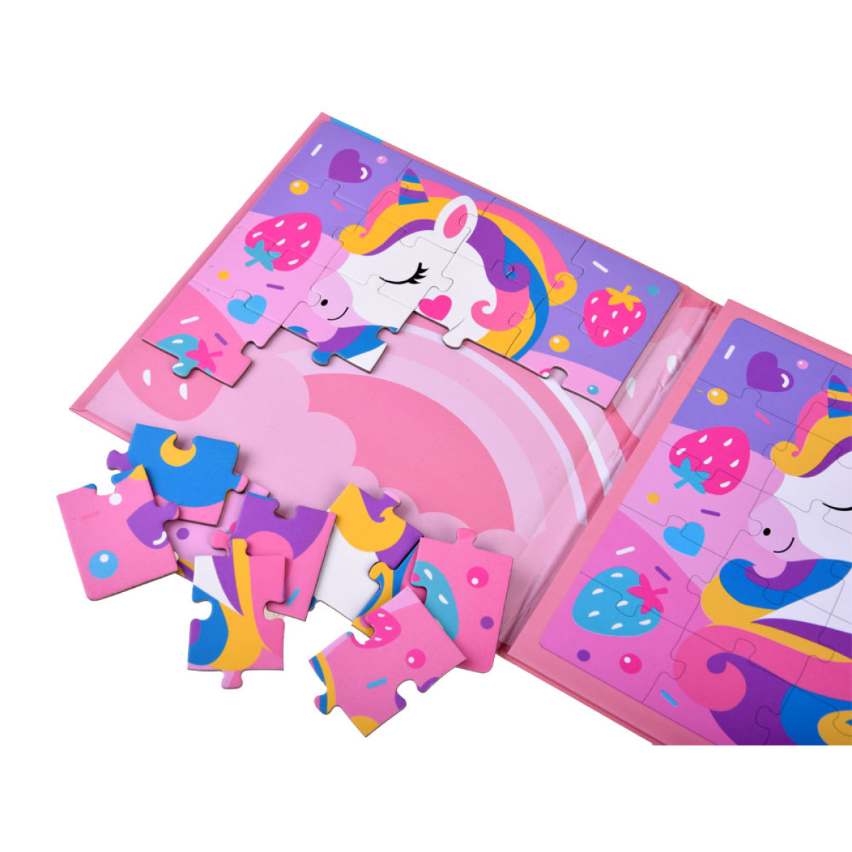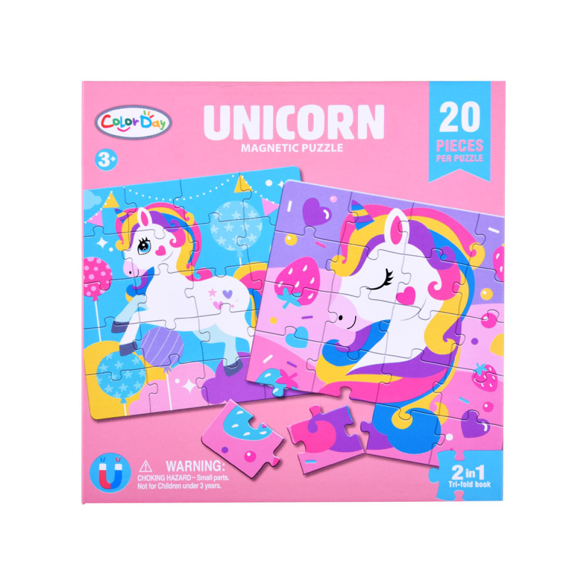 Värvilised magnetilised pusled on suletud kõvasse raamatusse, mis pakub lastele palju loovat lõbu. Komplekt sisaldab kahte magnettahvlit, millel on armsad ükssarvikud. Lapse ülesanne on pusletükke üksteisega sobitada ja tahvlile rõõmsameelne ükssarvik kokku panna.