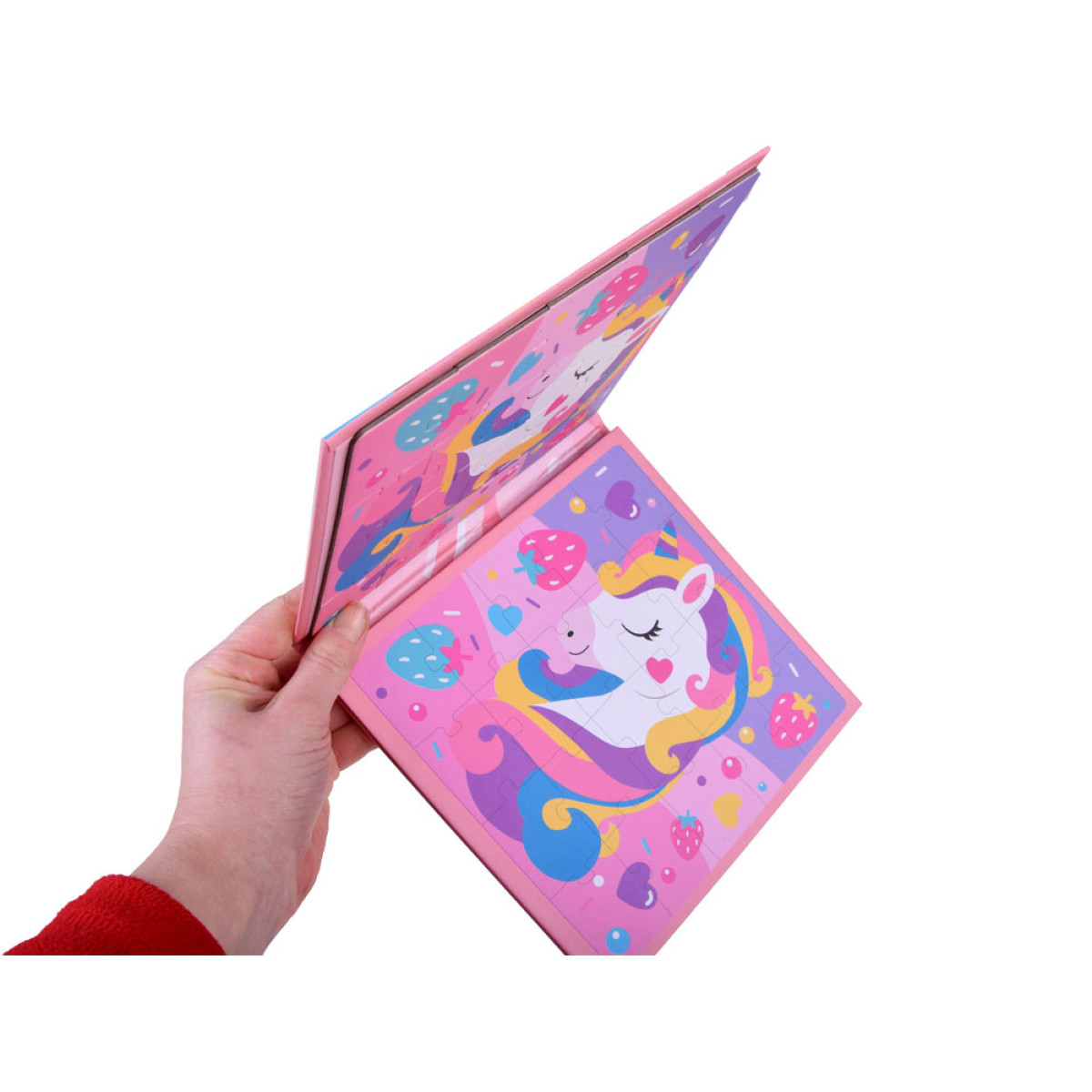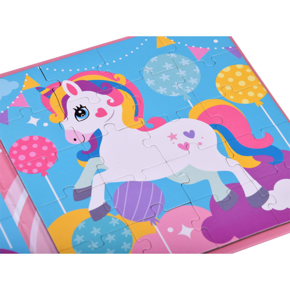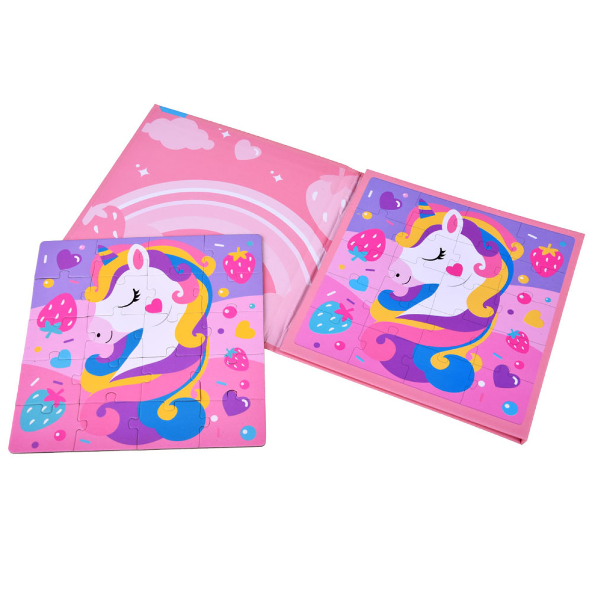 Värvilised magnetilised pusled on suletud kõvasse raamatusse, mis pakub lastele palju loovat lõbu. Komplekt sisaldab kahte magnettahvlit, millel on armsad ükssarvikud. Lapse ülesanne on pusletükke üksteisega sobitada ja tahvlile rõõmsameelne ükssarvik kokku panna.