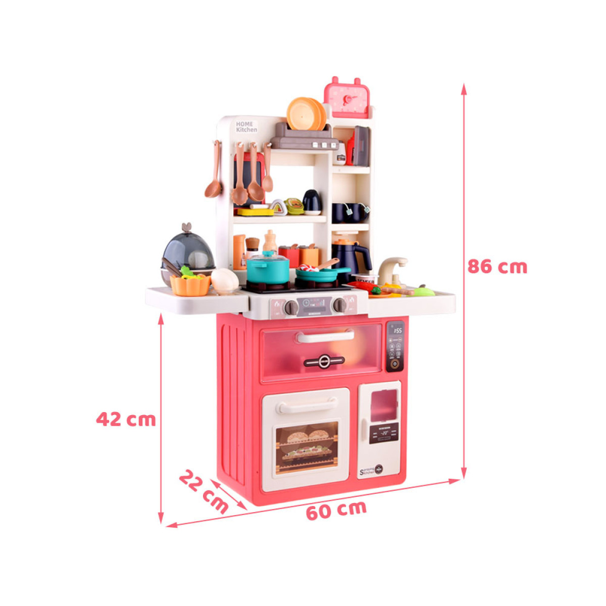 Köök on 86 cm kõrge, tööpinna kõrgus on 42 cm, tööpind on 60 cm pikk ja 22 cm lai. Toide: muna keetja 2 x 1,5V AA, õhupuhasti 3 x 1,5 V AA, gaasipliit 3 x 1,5 V (patareid ei ole komplektis). See köök võimaldab lastel ohutult mängida ja emale köögis järele teha. Köök on pakitud ilusasse karpi, mistõttu on see ideaalne kingitus teie lapsele.