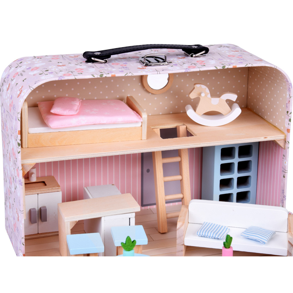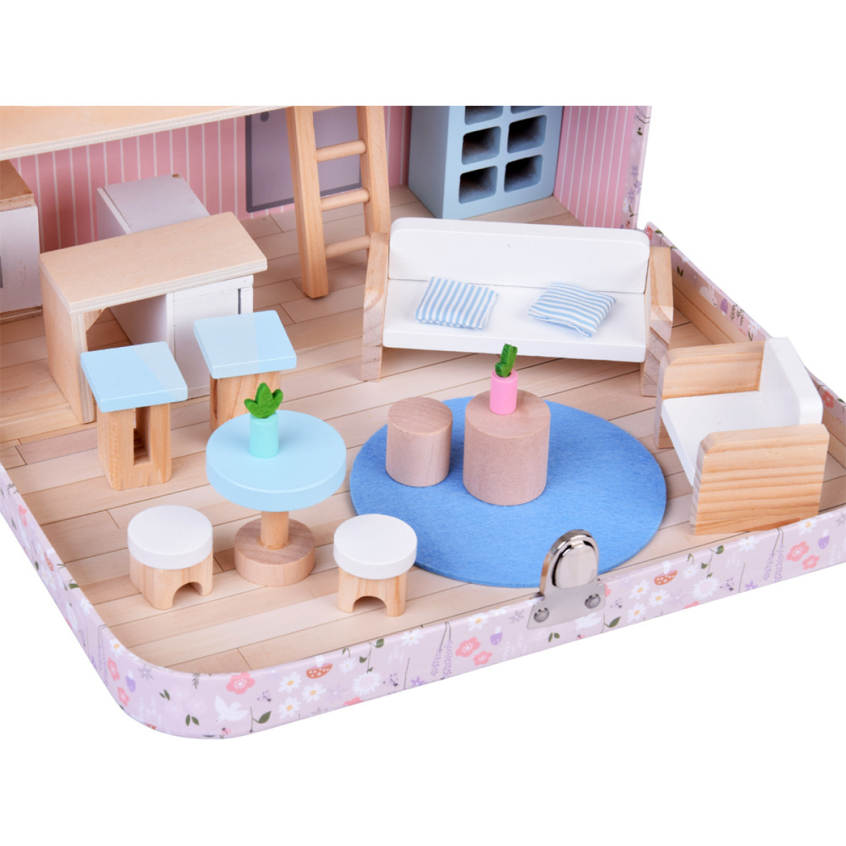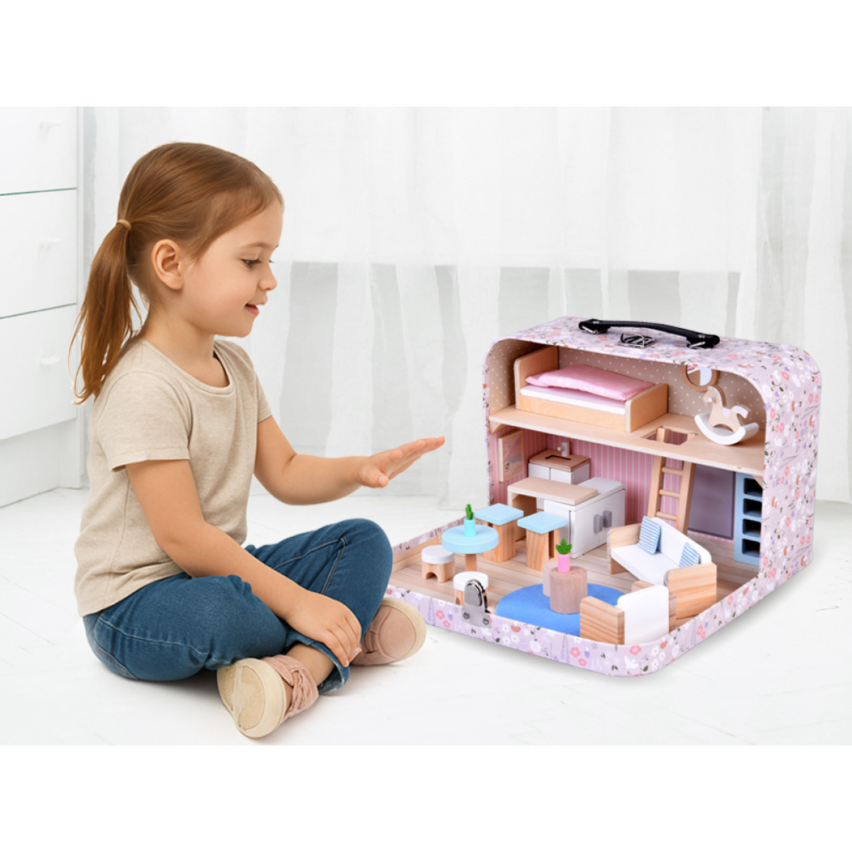 Kogu kohvris olev nukumajake on loodud arendama lapse loovust ja kujutlusvõimet. Seda on lihtne transportida, mistõttu sobib see suurepäraselt nii kodus mängimiseks kui ka reisil. Tugev valmistamine ja detailide hooldus tagavad, et komplekt teenib kaua aega ning selle ajatu, pastellne stiil võlub mitte ainult noorimaid, vaid ka täiskasvanuid, kes hindavad ilusaid ja nutikaid mänguasju.