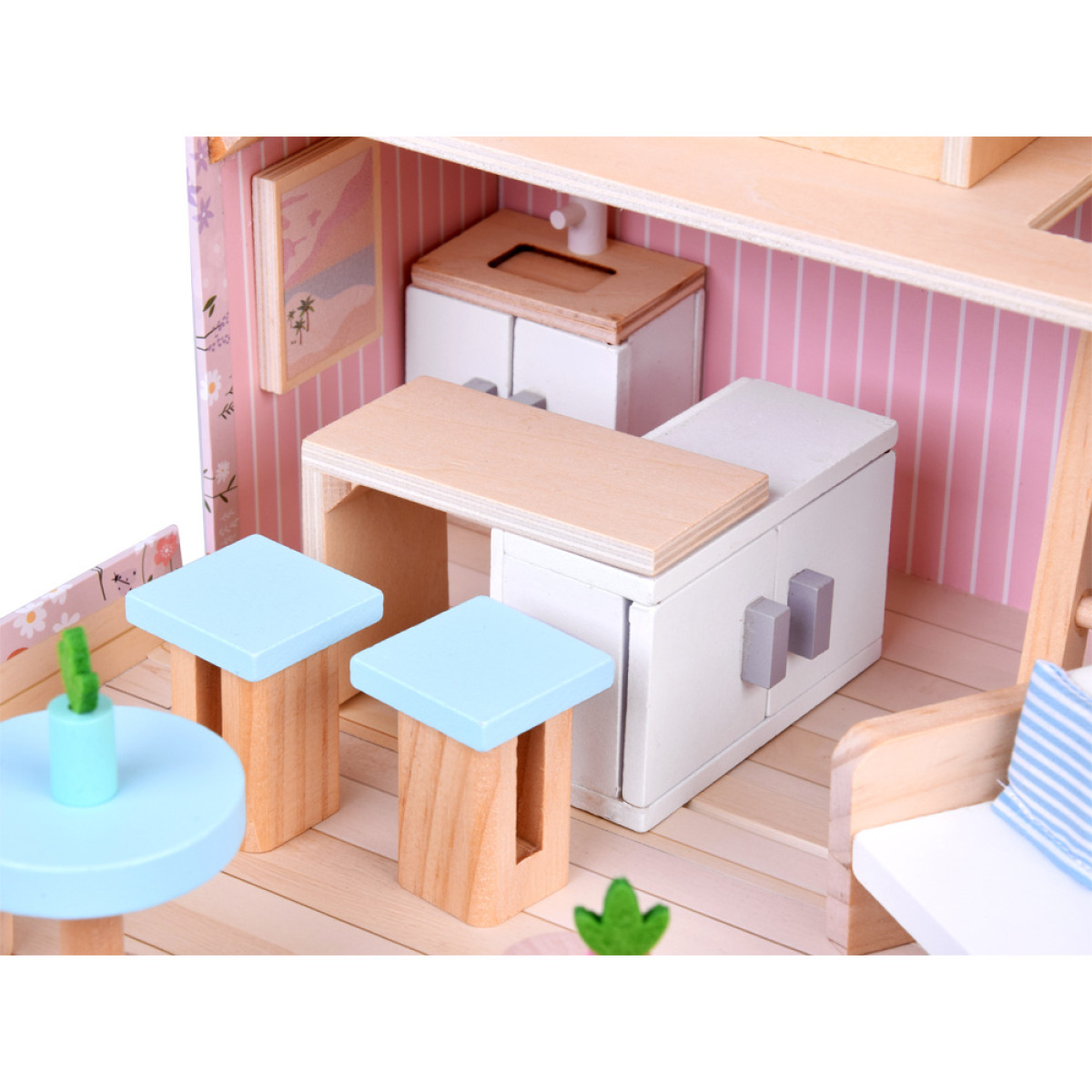 Alla viib väike redel, mida laps saab mängu ajal vabalt liigutada. Esimene korrus ühendab köögi ja elutoa, luues avara, avatud ruumi, mis on ideaalne koos kokkamiseks, puhkamiseks või külaliste vastuvõtmiseks (kasvõi kõige väiksemad plüüšsõbrad!). Köök on tõeline paradiis kulinaarsete lugude armastajatele. Siin on kapp kraanikausiga, täiendavad avanevad kapid liikuva tööpinnaga, kaks taburetti, pilt seinal ja praktiline riiul asjade hoidmiseks. Tagaseinal on maalitud dekoratiivsed uksed, mis loovad suurema ruumi illusiooni ja lisavad kogu stseenile realismi. Vertikaalsete triipudega tapeet lisab elegantsi ja kergust.