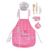 Komplekti kuuluvad põll, kokamüts ja toiduvalmistamise lisatarvikud nagu: kaitsekinnas, kuumanõude padi, puidust taignarull ja lusikas ning metallist vispli. Riietus on valmistatud pehmest kangast, mis kindlasti suurendab selle mugavust. Kaunis lõige, esteetilised äärised, võluv ruuduline muster ja magus roosa ja valge värv muudavad toote visuaalselt atraktiivseks. Materjal on ohutu ja kergesti puhastatav. Nööritav ülikond on mitmekülgne ja mugav. Sobib erinevas vanuses ja kehakaalus lastele. Sobib nii väiksematele kui ka suurematele lastele.