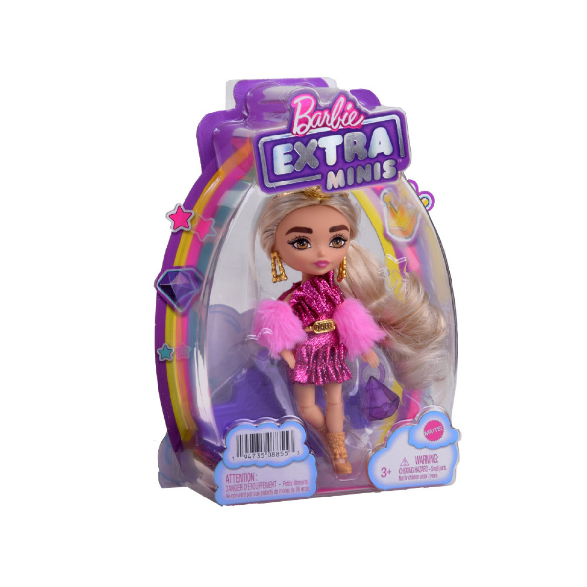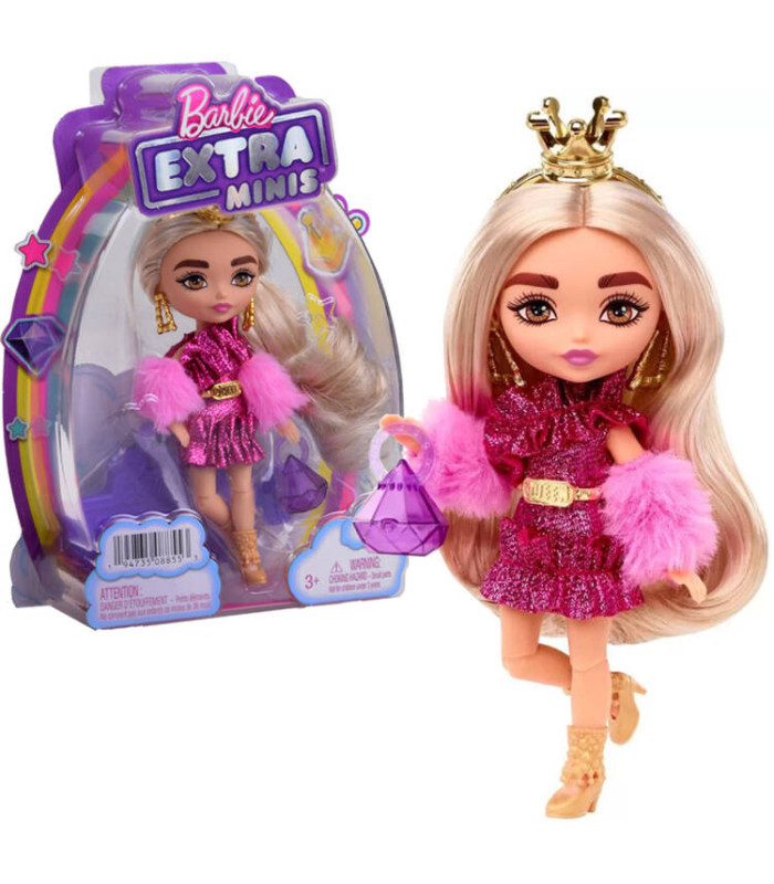 Barbie Extra Minis seeria nukk köidab iga noore moesõbra südame. Selle seeria nukud armastavad moodi; igaüks neist on oma ainulaadse stiiliga. Nukul on pikad blondid juuksed, päikesest suudeldud jume, kuldne kroon peas, jalas kaunid kuldsed kontsakingad ja kõrvas kuldsed kõrvarõngad. Kogu stiili maagia tuleb esile tänu kaunile roosale sädelevale kleidile koos vööga, ning karvkattega käepaelale. Stiili täiendab teemantikujuline käekott. Kogu komplekt on väga armas ja kindlasti võlub igat tüdrukut. Kaasasolev nuku alus võimaldab nukku erinevates poosides esitleda kogutud kollektsiooni hulgas.