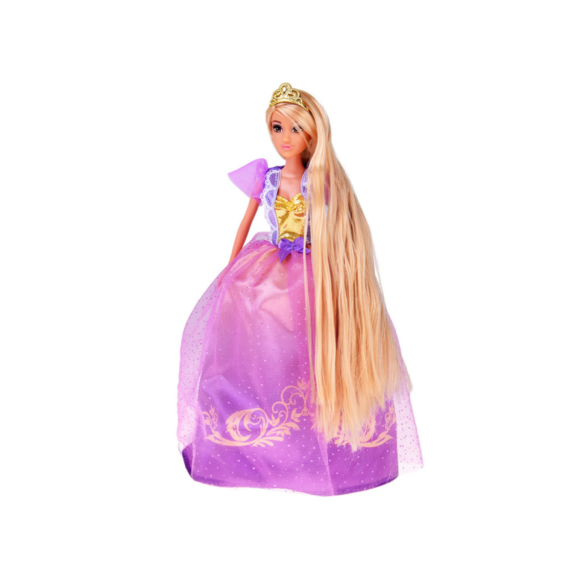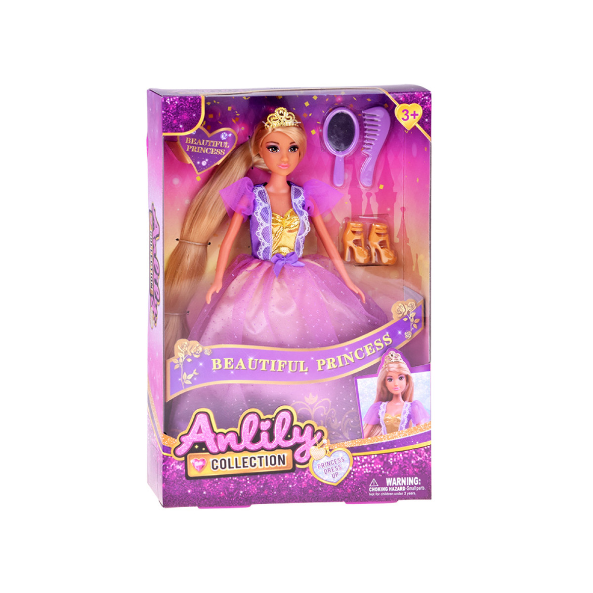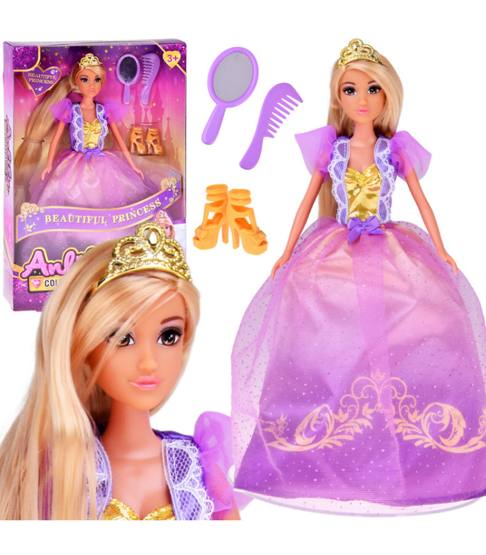 Pikkade juustega printsessinukk lillakas-kuldse ballikleidiga + aksessuaarid