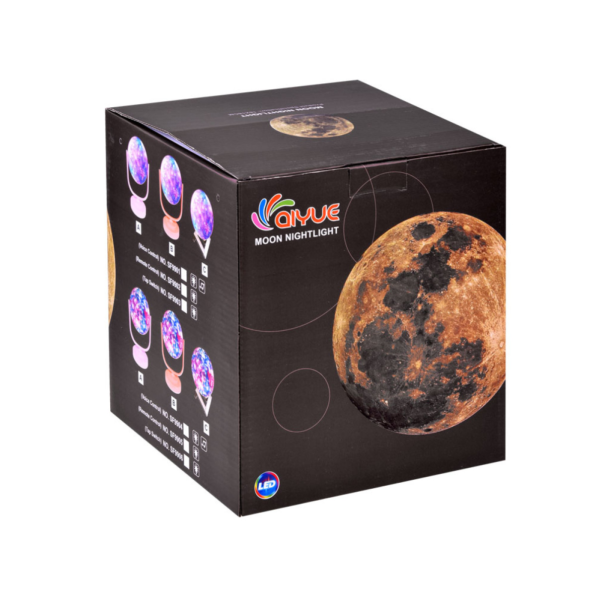 Kuuvalgus Öölamp 3D on fantastiline kaunistus laste tuppa. Sageli on väikestel lastel probleeme pimedas toas magama jäämisega. Tänu öölambile, millel on valgustuse värvi valiku võimalus, saab laps rahulikult uinuda ja kõik hirmud kaovad. Lamp töötab USB-pordi kaudu ja selle sisselülitamiseks tuleb hoida all lampi põhjas olevat nuppu. Valgustuse saab valida puutetundlikult. Piisab, kui puudutada lampi, et seada sooja või külma valgust, ning reguleerida valguse heledust või hämarust. Kuu on asetatud elegantsel puidust alusel. Öölamp on täiuslikult jäljendatud, omades karedat pinda, mis imiteerib kraatreid, tänu innovatiivsele 3D-printimise meetodile.