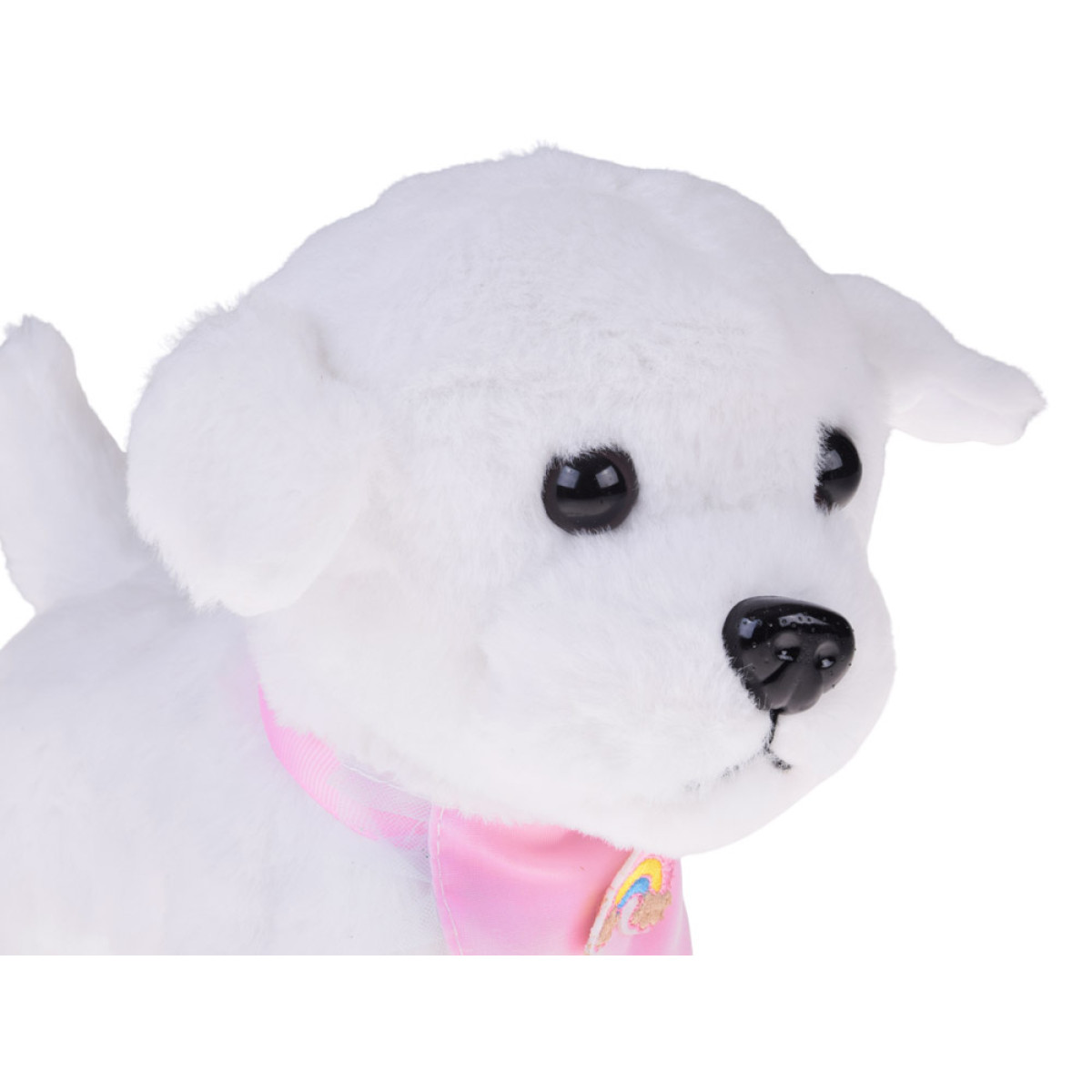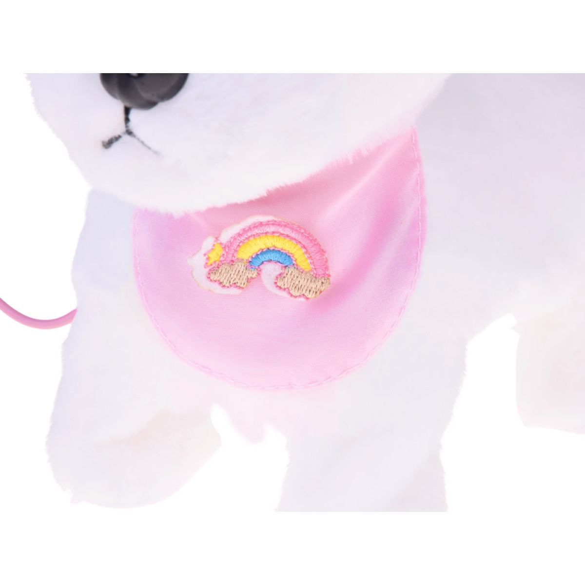 - Valge koera kaelas on armas volangiga bandaan ja vikerkaarega embleem.