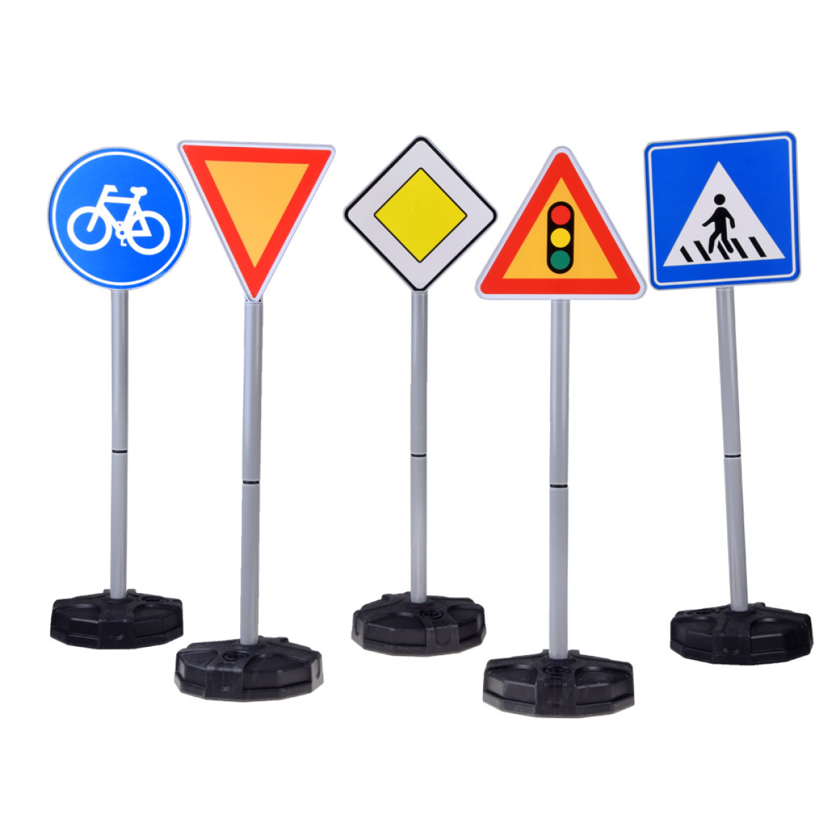 Iga märk koosneb alusosast, torudest ja ühendusdetailidest, mida on lihtne kokku panna. Aluseid saab täita vee või liivaga, et tagada stabiilsus aktiivse mängu ajal. Märgid on valmistatud kergest, kuid vastupidavast materjalist, mis on lastele ohutu. Värvikad kleebised on selged ja hästi nähtavad, hõlbustades nende tähenduste meeldejätmist.