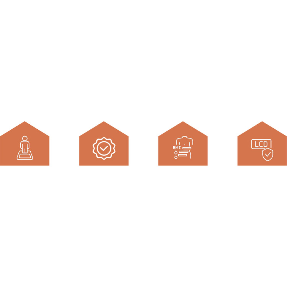 - LCD ekranas - iš karto rodo 8 duomenų vienetus: svoris, kūno forma, kūno riebalų procentas, KMI, raumenų masė, kaulų masė, kūno vanduo ir visceraliniai riebalai