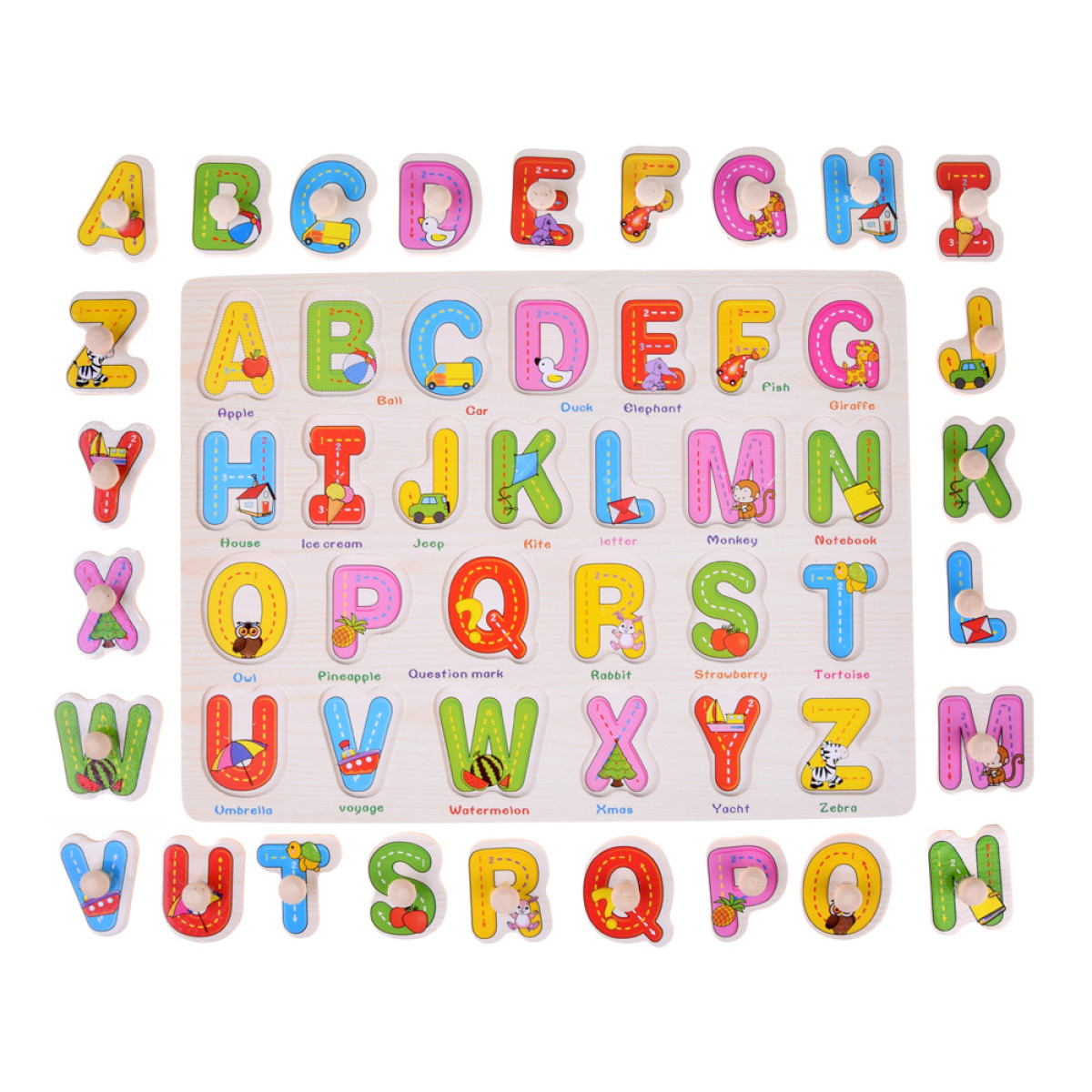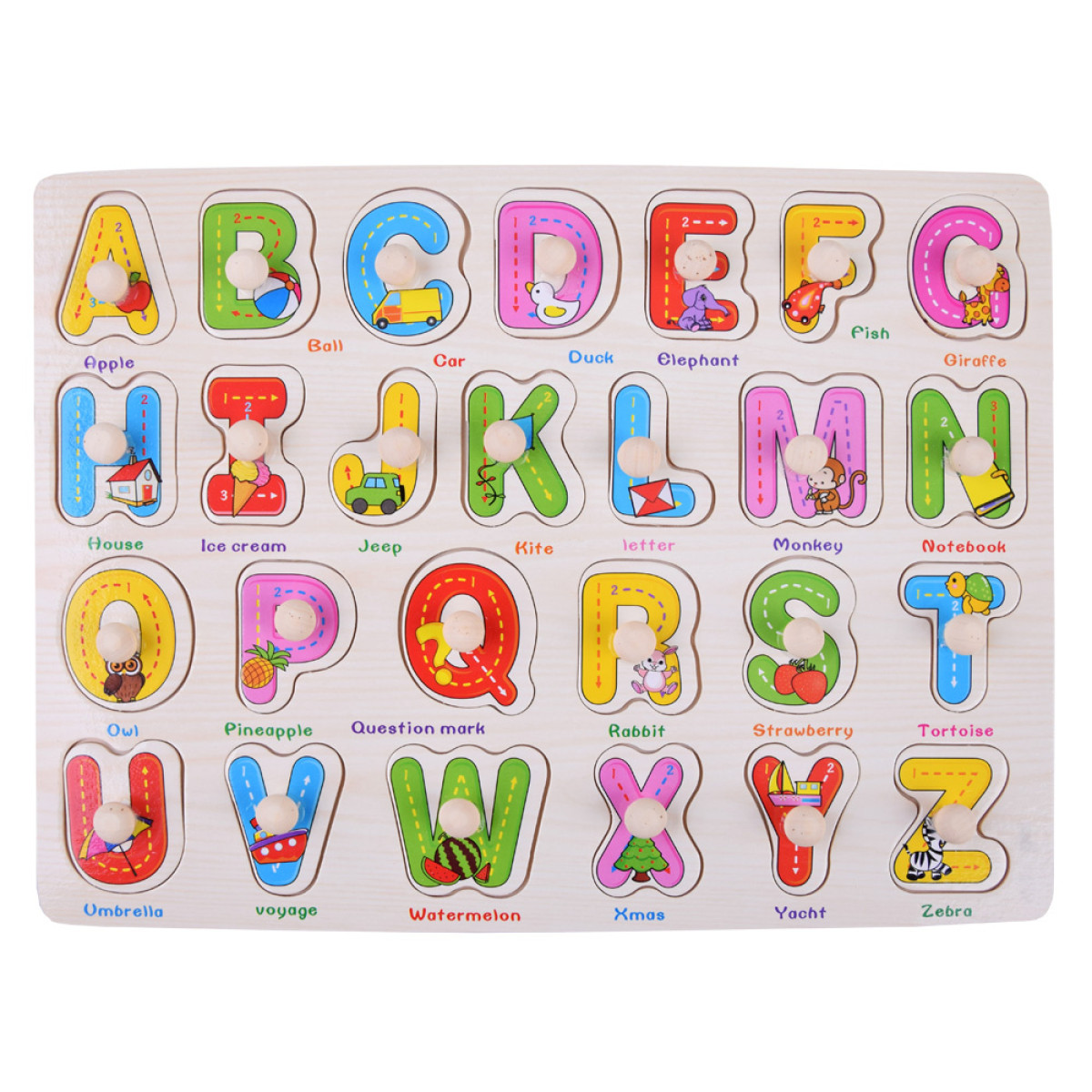 Puidust tahvel värviliste tähtedega, mis võimaldab lapsel õppida läbi mängu. Tahvel sisaldab 26 suurt värvilist tähte koos käepidemetega, mis muudavad nende hõlpsama eemaldamise ja asendamise lihtsamaks. Lisaks on igal tähel oma värv, pilt ja nimi inglise keeles.