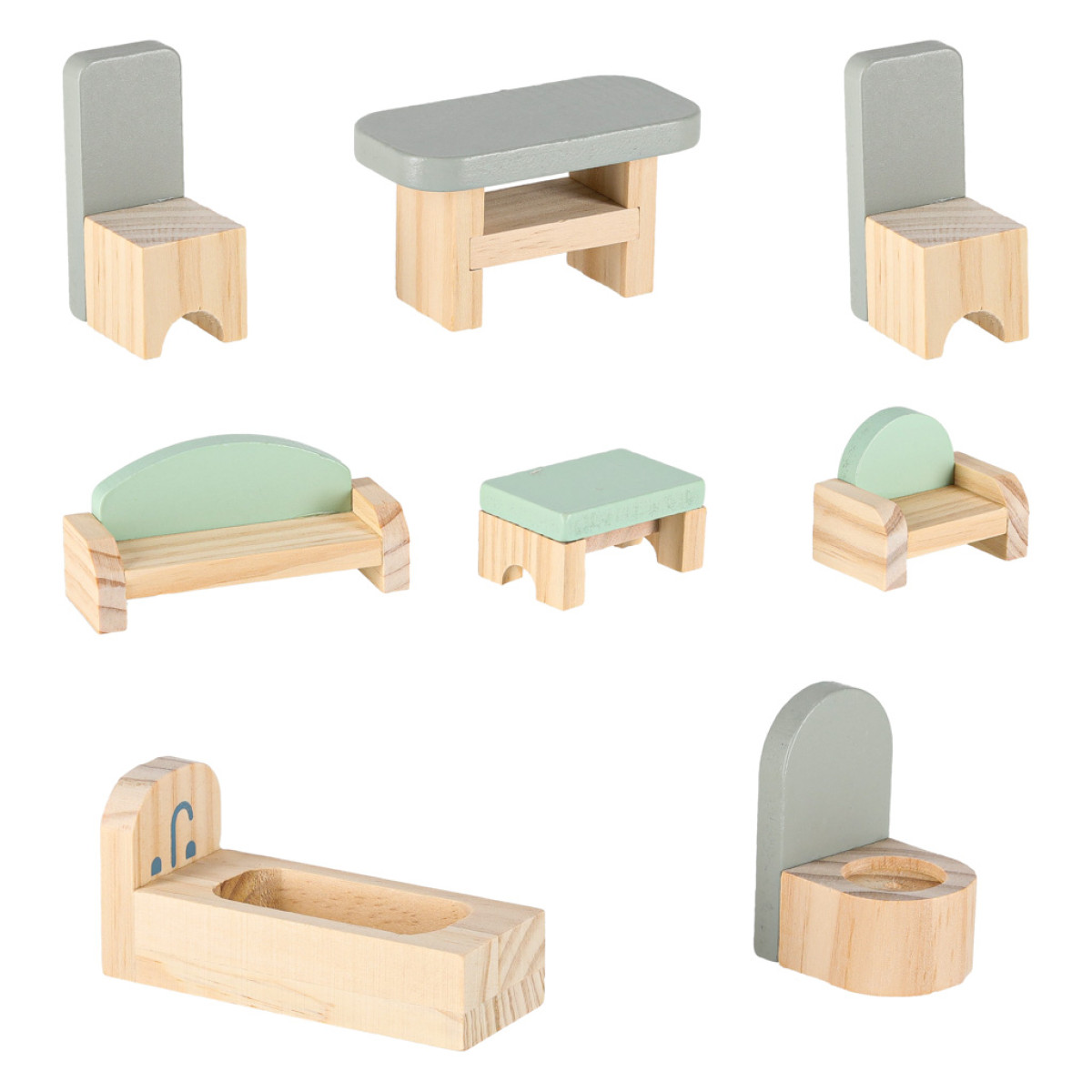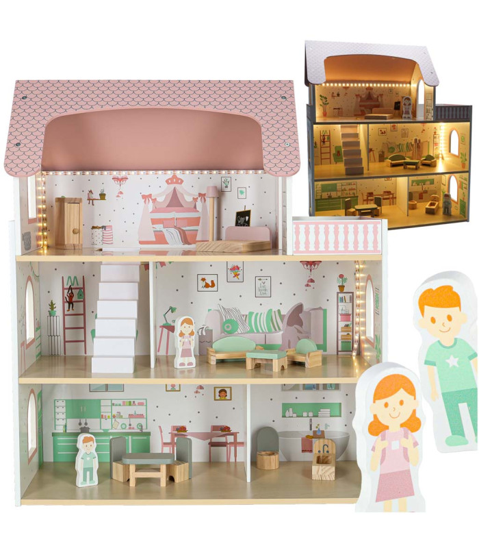 Pastelsetes toonides puidust mööbliga nukumaja lisab veidi realismi ja kaunistab iga laste tuba. Nukud - poiss ja tüdruk - elavad nukumajas ja nende igapäevased seiklused köidavad kindlasti nooremaid mängijaid.