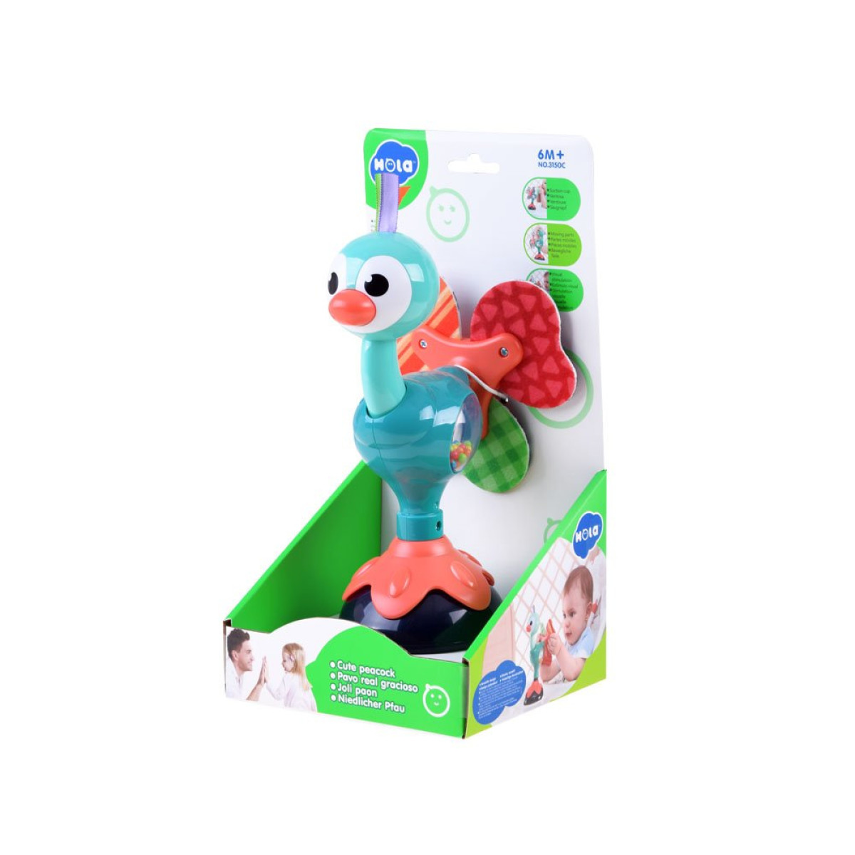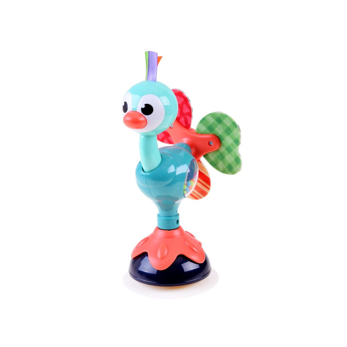 Võluv värvilise paavsti kõristi iminapaga on ideaalne mänguasi väikestele lastele. Mänguasi on täielikult valmistatud plastikust koos materjali lisanditega (paabulinnu saba), varustatud kummist iminapaga, mis võimaldab seda hõlpsasti kinnitada laua, põranda või söögitooli sileda pinna külge.