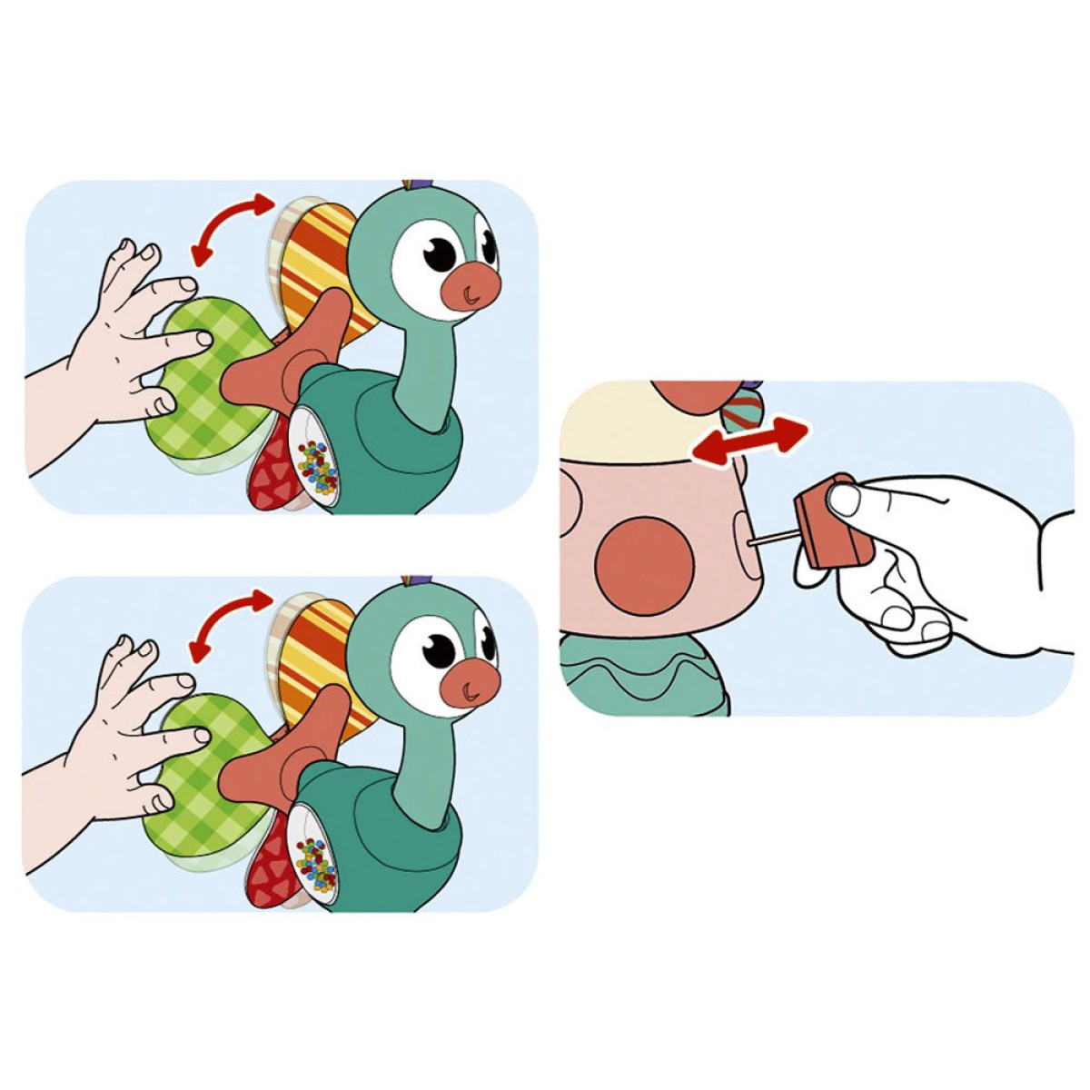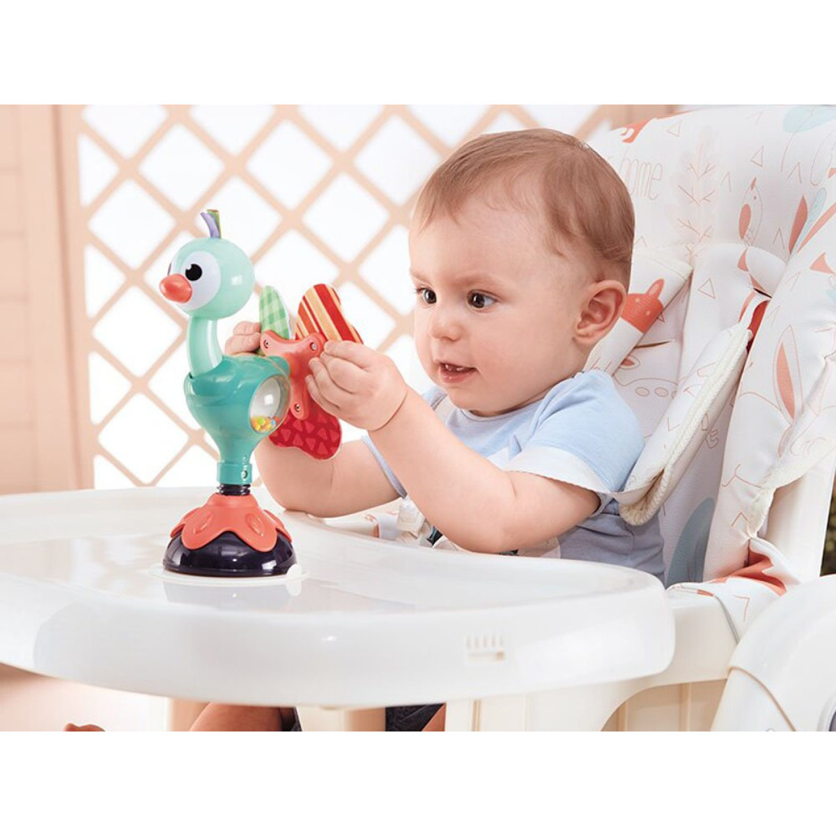 Värviline paabulind on kindlasti suurepärane abimees lapse toitmise ajal, tavalises mängus või igal ajal, kui on vaja last lõbustada ja naerma ajada. Mänguasi keerutab kergelt kõrisevaid helisid, on värvikas ja huvitav. Laps saab seda kõigutada ja pöörata igas suunas, kui see on õigesti pinnale kinnitatud.