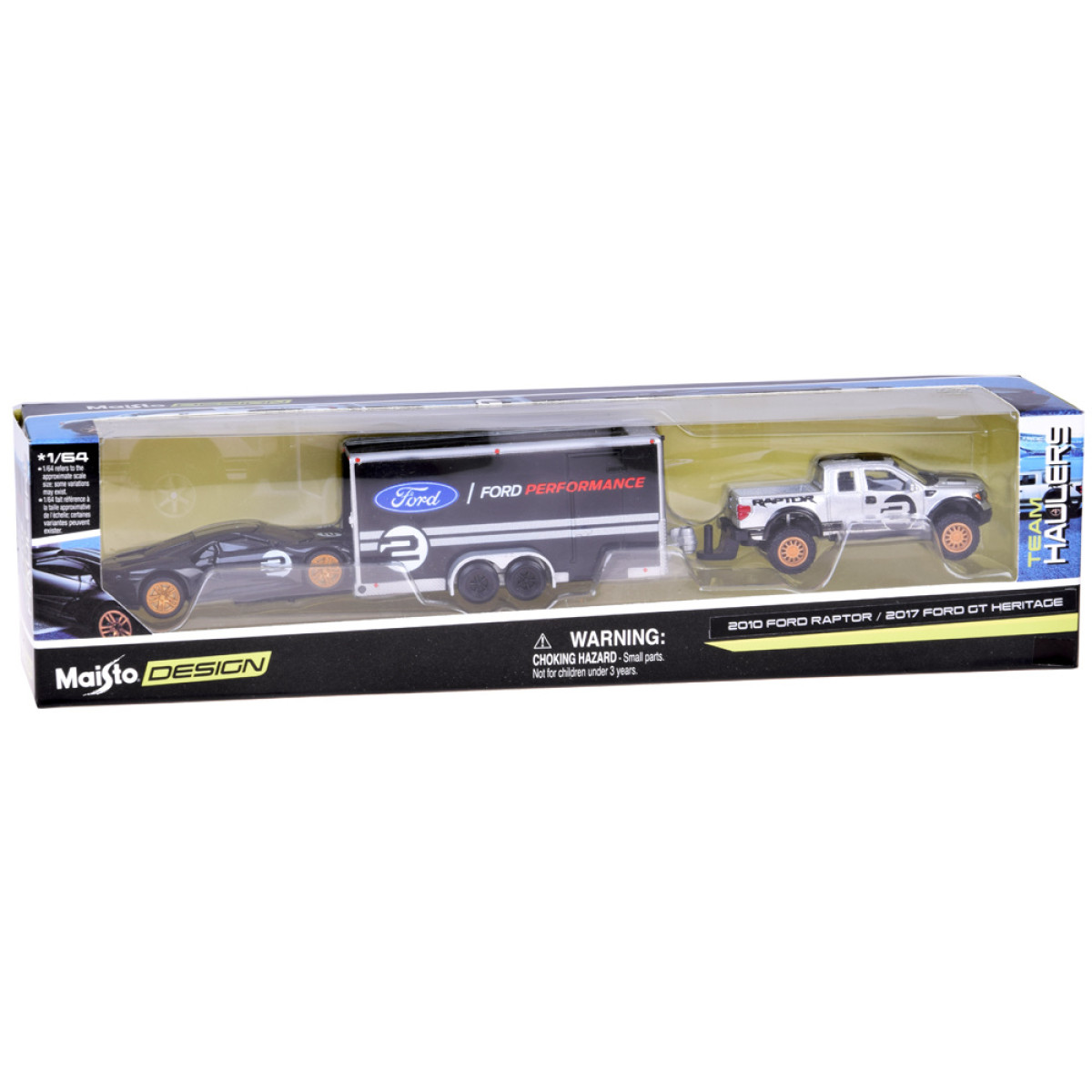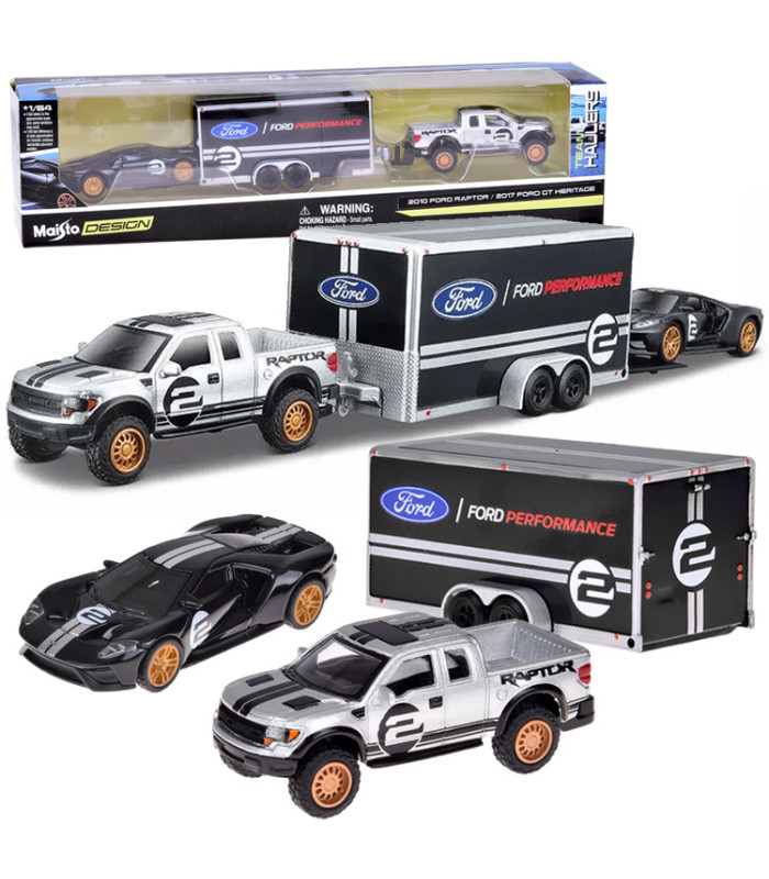 Maisto litsentseeritud metallist autod 1:64 – Ford Raptor 2010 ja Ford GT Heritage 2017 koos haagisega