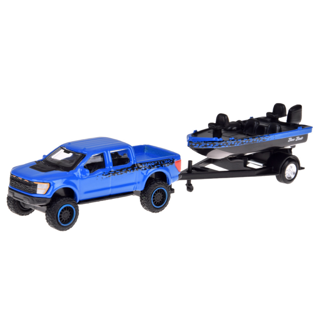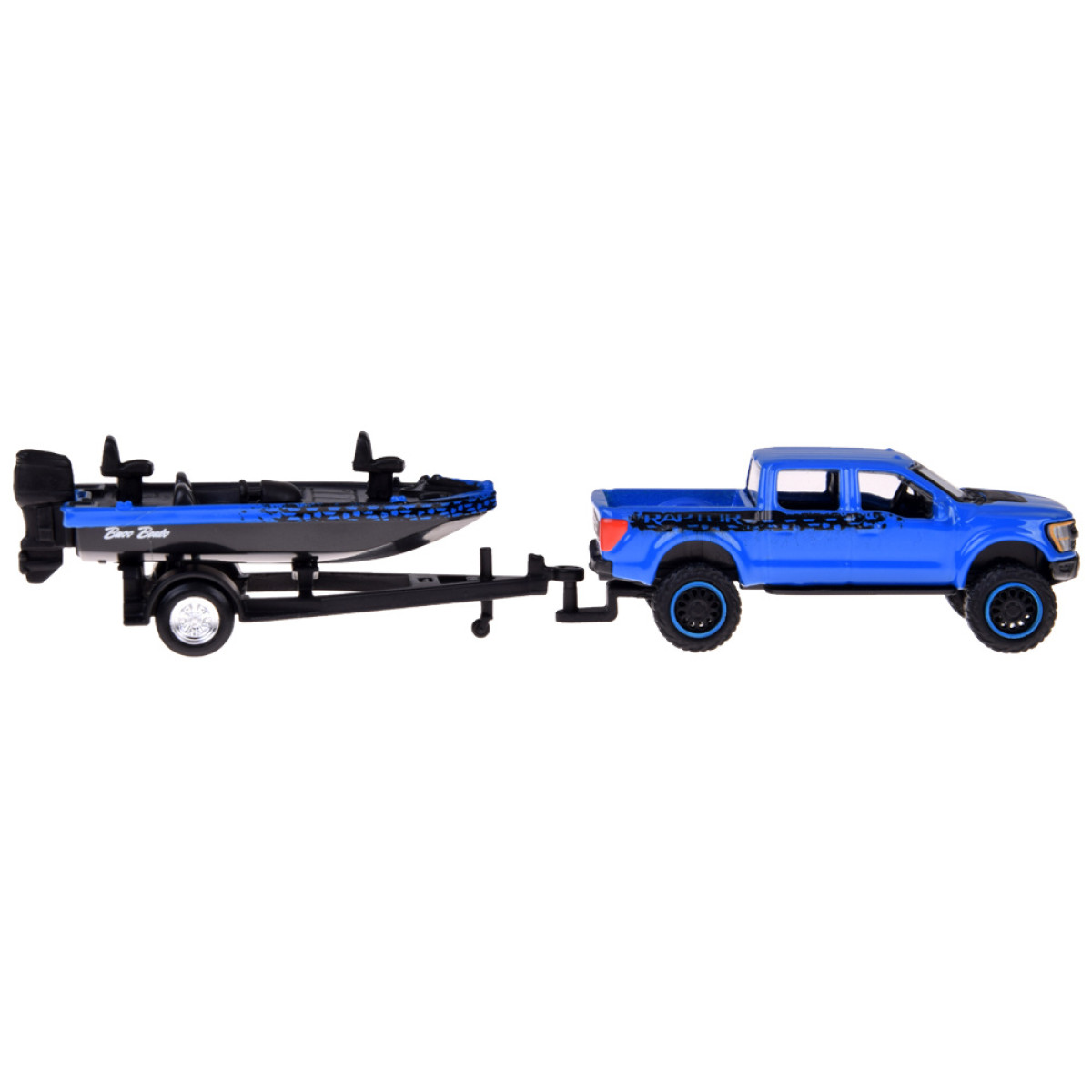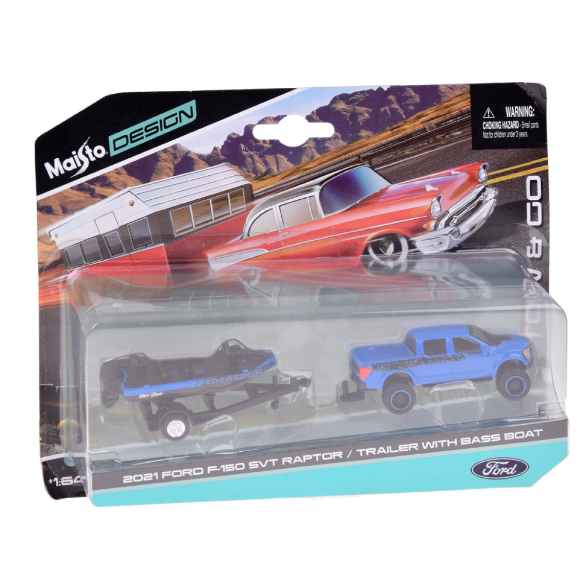Modell on tumesinises ja mustas värvikombinatsioonis, andes sellele sportliku ja klassikalise ilme. Ford F-150 SVT Raptoril on konks, mis võimaldab kinnitada paadiga haagist. Konksu saab eemaldada kruvi abil ning haagist saab samuti lahti ühendada ilma konksu eemaldamata. Paadi realistlik välimus haagise peal lisab komplektile tõetruudust, muutes selle suurepäraseks nii kollektsionääri riiulil kui ka mängus.