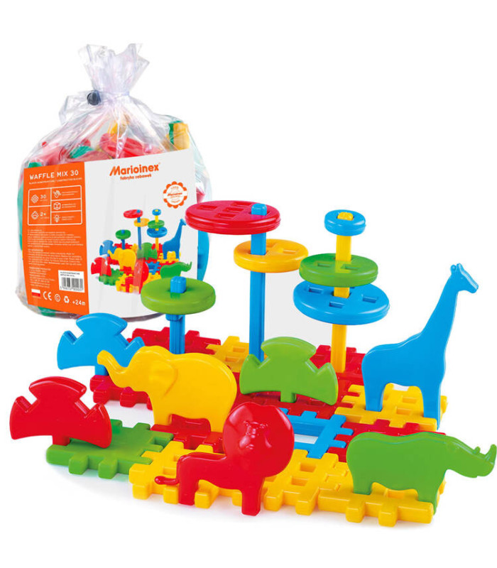 Marioinex Klockid Waflid Mix 30 on loodud olema võimalikult sõbralikud ja ohutud lastele. Need on valmistatud paindlikust, pehmest ja meeldiva puudutusega materjalist. Nende kuju on ideaalselt kohandatud laste käte kujule ja suurusele, kasutatud värvid on mahedad ja meeldivad silmale. Zoo komplekt võimaldab meie laste jaoks luua väikese loomaaia, kus elavad elevant, lõvi, kaelkirjak ja ninasarvik. Klockid on kergesti ühendatavad ning neil on erksad värvid, mis võimaldavad lastel oma kujutlusvõimet kasutada ja midagi imelist luua.