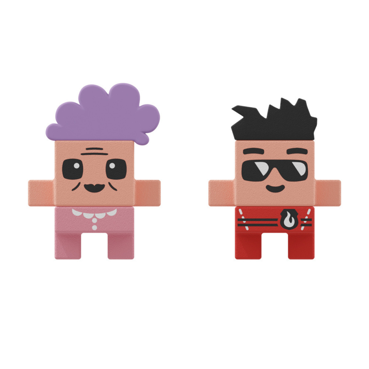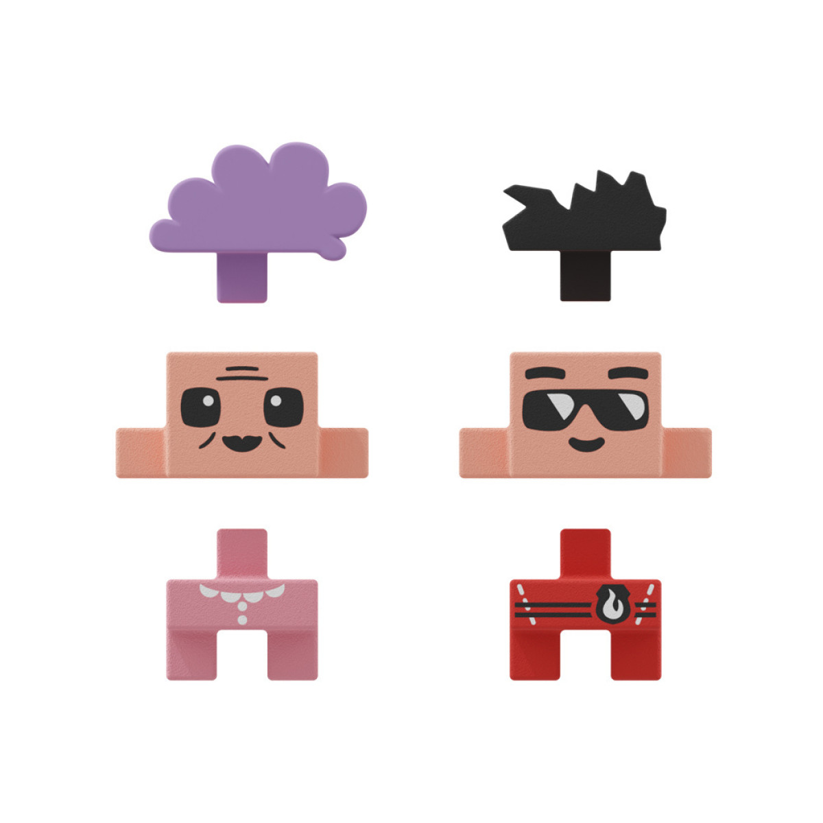 Figurite kõrgus on umbes 3 cm ja klotside mõõtmed on ligikaudu 3,5 cm x 3,5 cm x 0,5 cm.