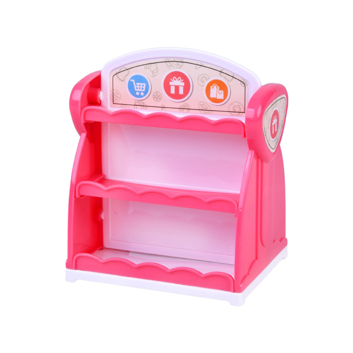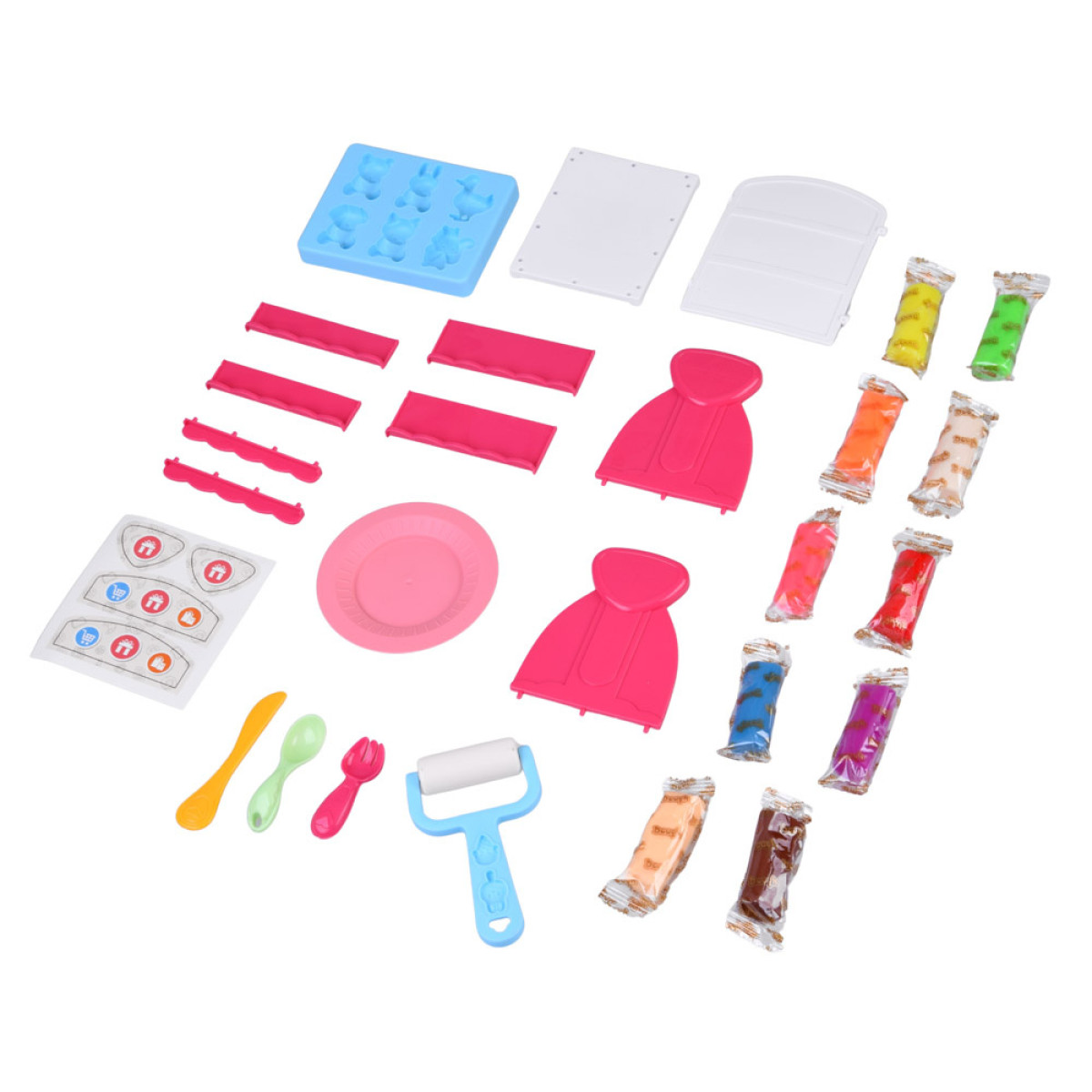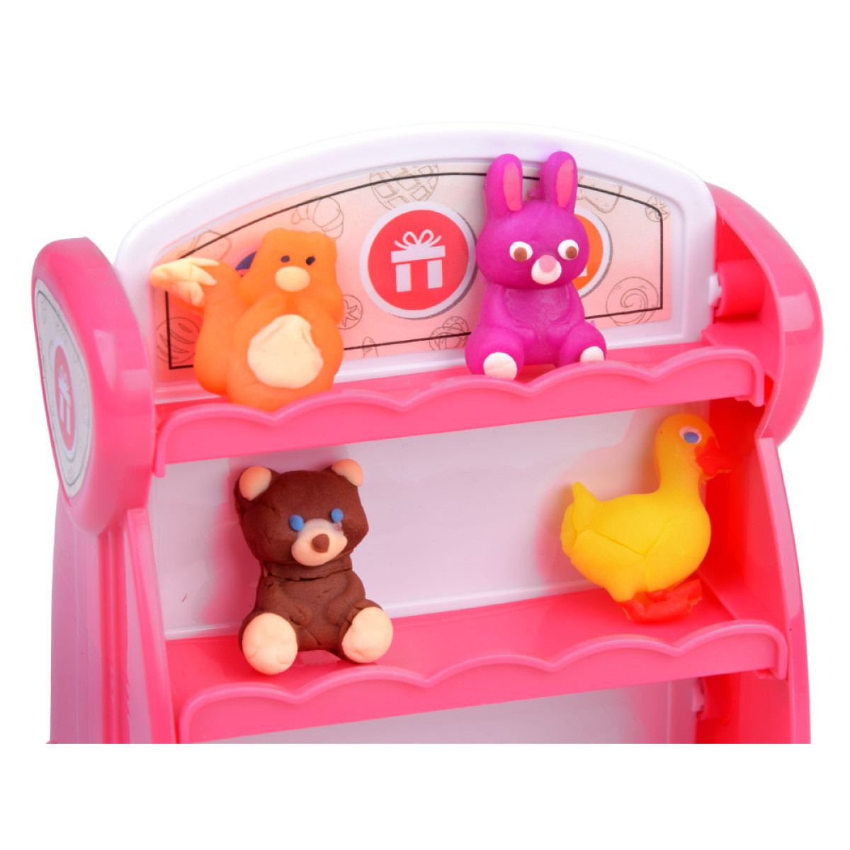 eriline eelis: komplektis on kahepoolne roosa esitlusriiul, mis meenutab väikest poodi. Mõlemal küljel on kolm riiulit, kuhu saab valminud figuurid välja panna. Nii saab laps mitte ainult voolida, vaid ka oma töid esitleda nagu päris väljapanekul.