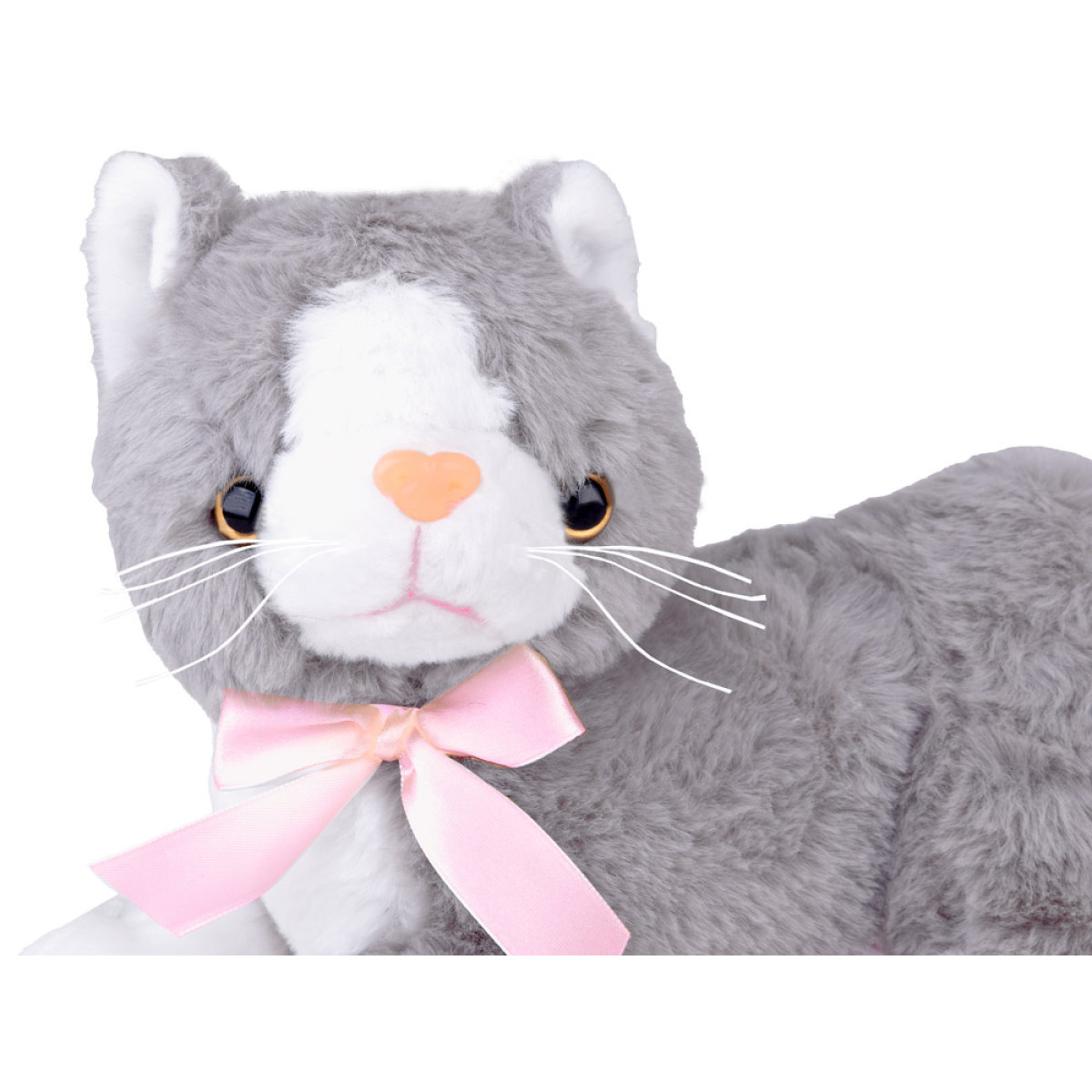 Kassipoeg on valmistatud pehmest ja meeldivast materjalist. Säravad silmad ja roosa nina on tehtud plastikust. Armas kassinägu on kaunistatud valgete pikkade vuntsidega, mis on tehtud paksust niidist. Lisaks on kassipoeg kaunistatud roosa satiinlindiga, mis muudab selle erakordselt elegantseks ja efektseks.
