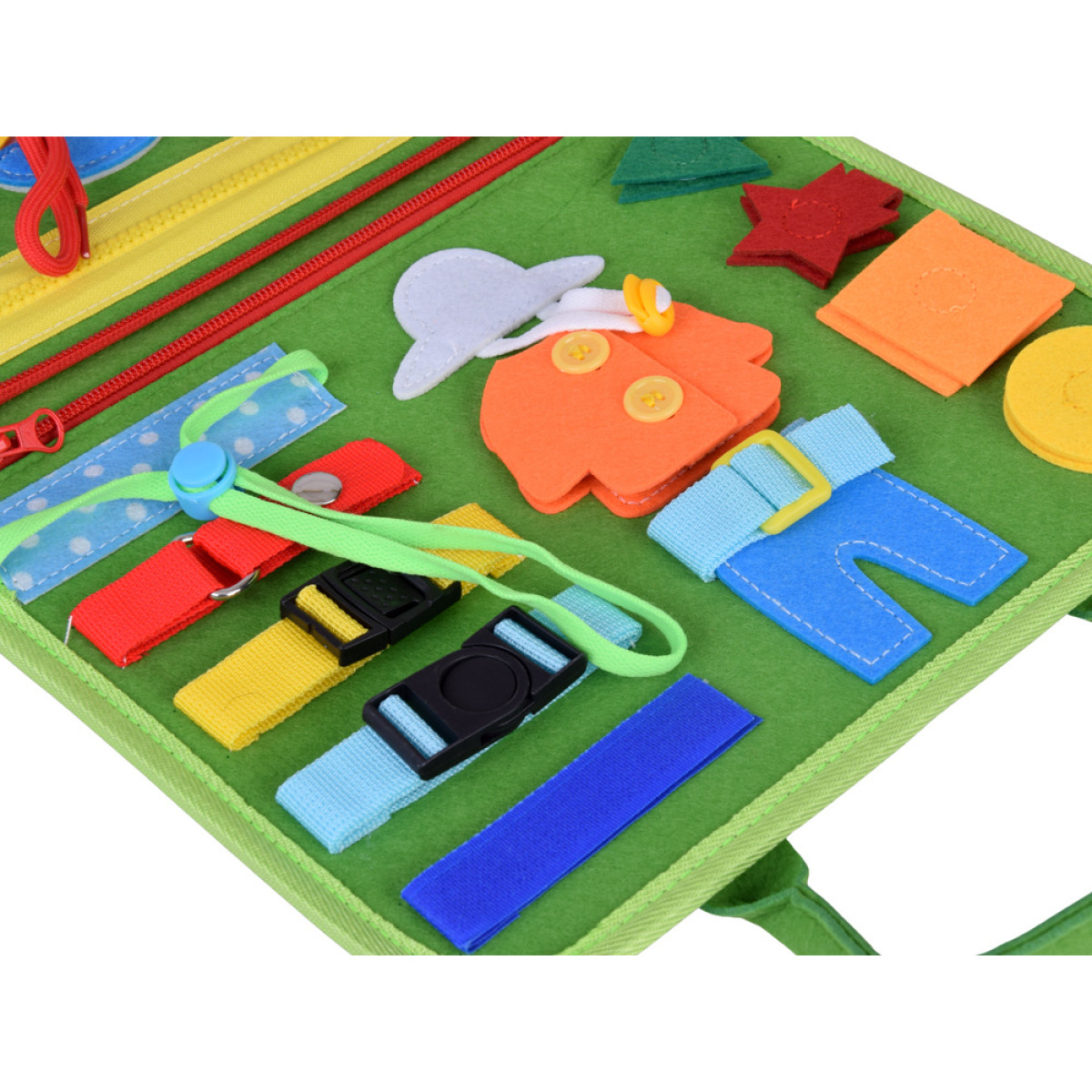 Lehekülg 1 – Riietumise õppimine: Rõivaelemendid lukustamiseks, avamiseks, sidumiseks ja läbipõimimiseks. Laps arendab sõrmeoskusi ja õpib iseseisvust riietumisel.