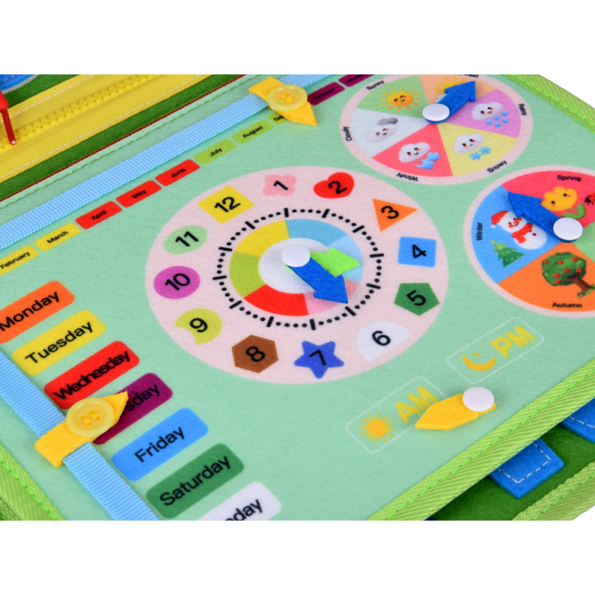 Lehekülg 5 – Kalender ja kell: Nädala päevade, kuu, aastaaegade ja ilma markerid ning pööratavate osutitega kell – õppimine aja ja päeva rütmi kohta läbi mängu.