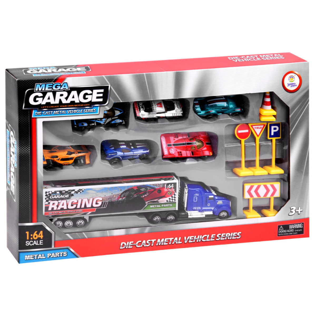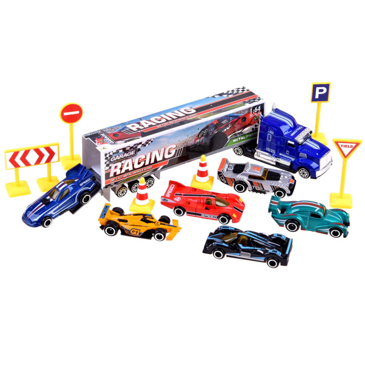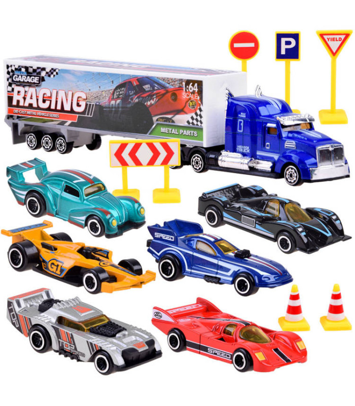 Seitsme auto ja liiklusmärkide komplekt on mõeldud igale väikesele autojuhile mängimiseks. Autode kaross on valmistatud metallist ja šassii plastikust. Igal sõidukil on erinev stiil ja värv. Sportautod ja suur haagisega veok pakuvad palju lõbusat mänguaega. Väikesed, suurepäraselt valmistatud autod, tuntud kõigile poistele, laiendavad kindlasti kollektsiooni või alustavad uut mänguasjade kogu.