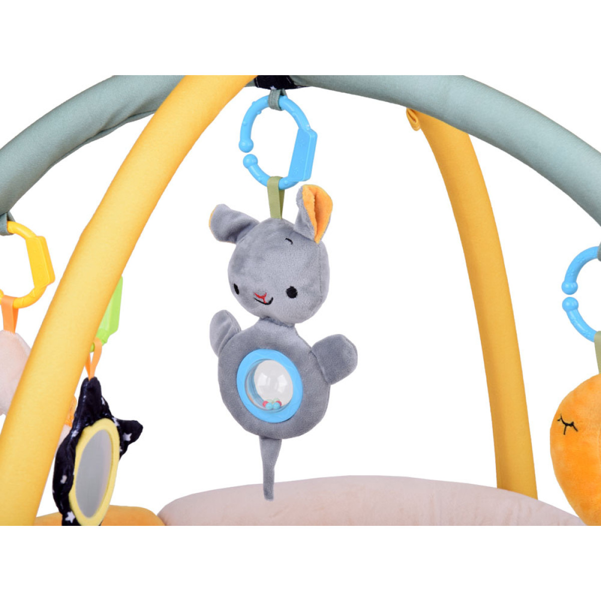 Komplektis on kaks painduva kaarega riba, millele saab riputada neli võluvat mänguasja. Iga mänguasi on loodud arendama lapse meeli – nii nägemist, puudutust kui kuulmist.