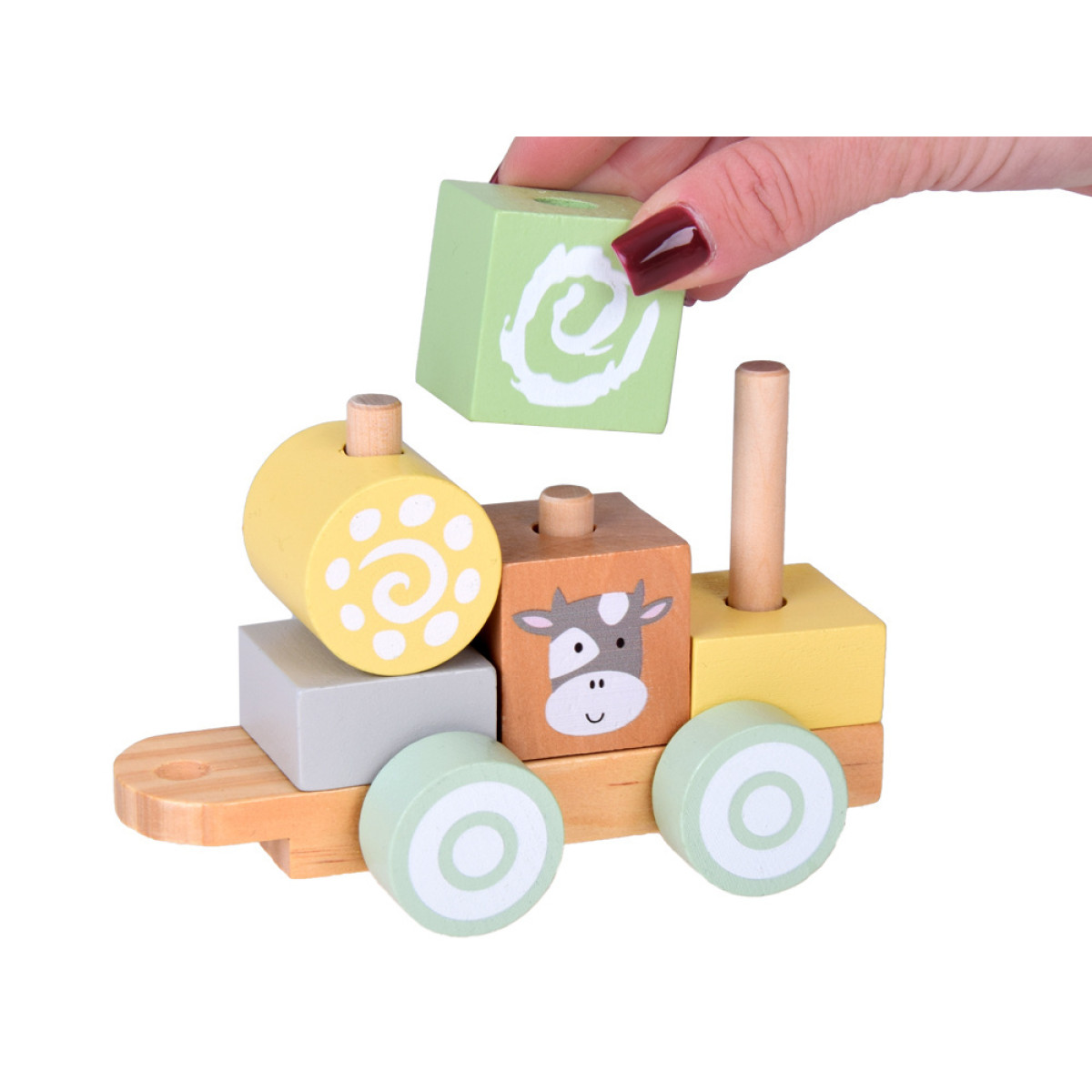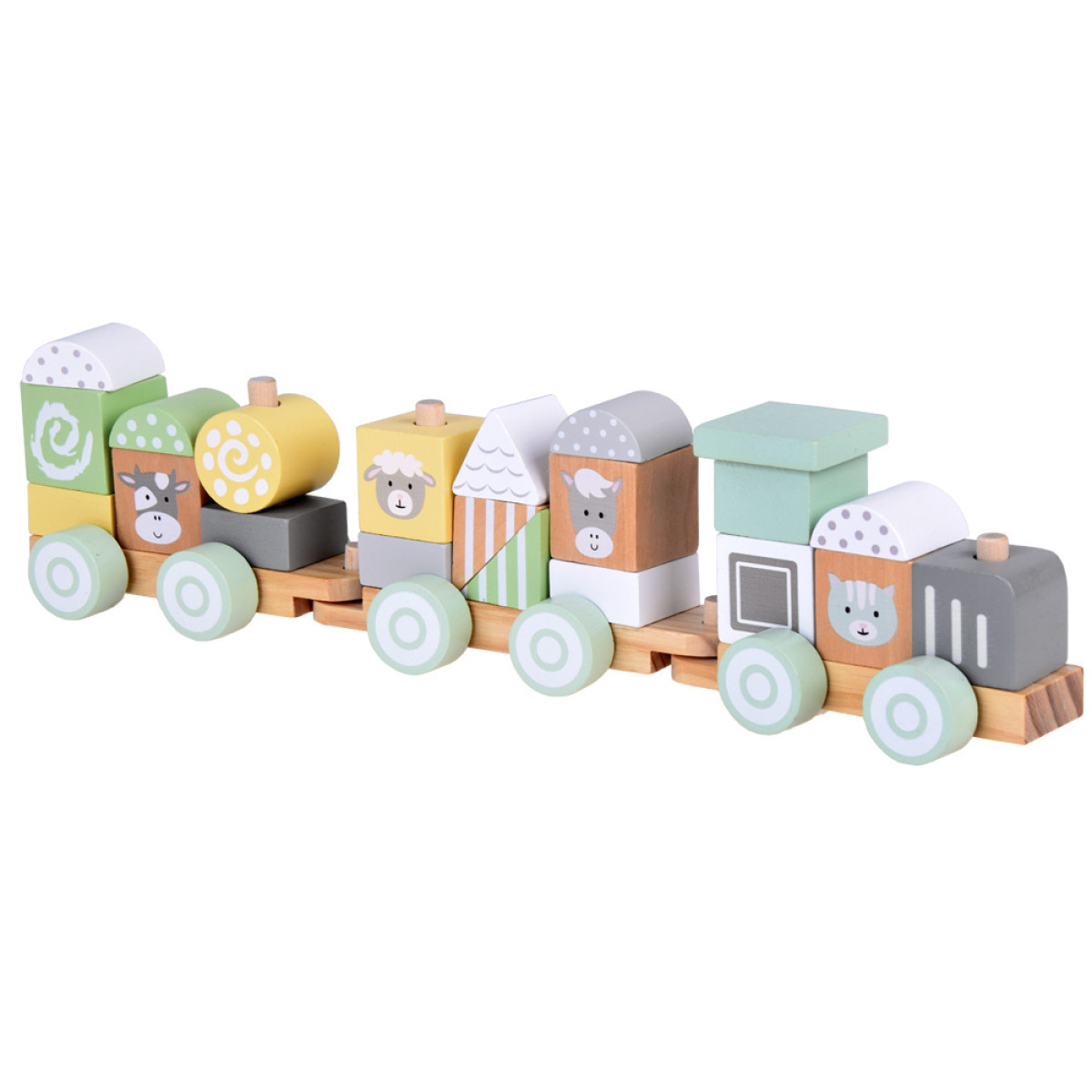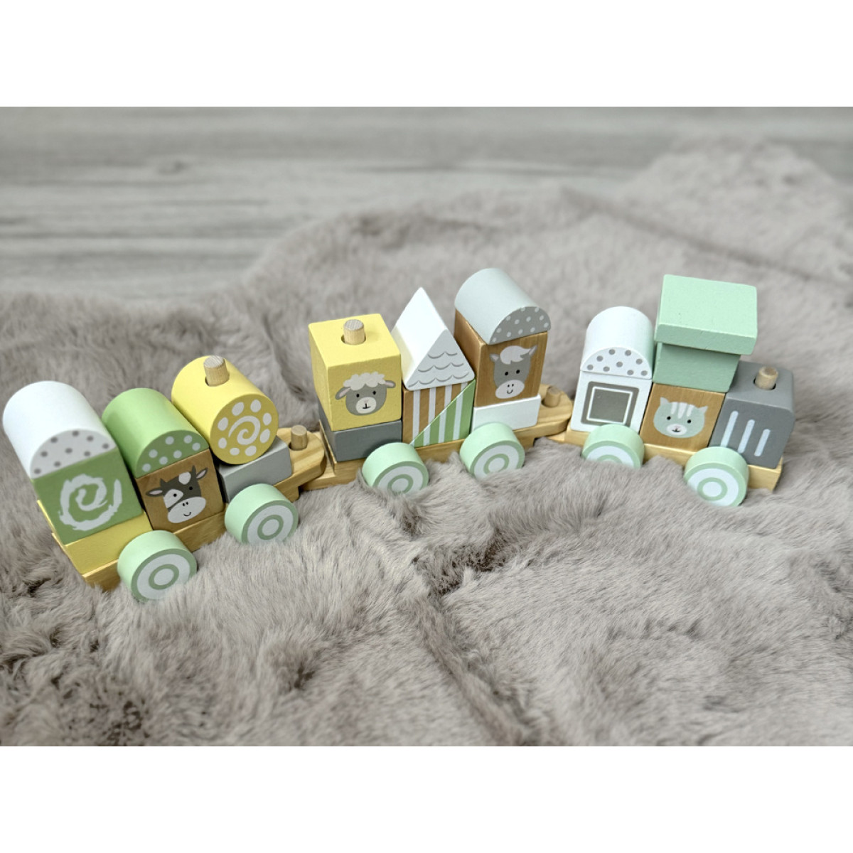 Iga vagun on kindlalt valmistatud vastupidavast puidust ja ühendub kergesti, luues pika rongikoosseisu, mida lapsed saavad mööda põrandat liigutada. Pastelne, rahulik värvigamma annab mänguasjale ainulaadse võlu ja sobib suurepäraselt igasse lastetuppa.