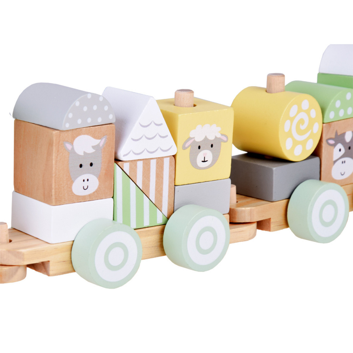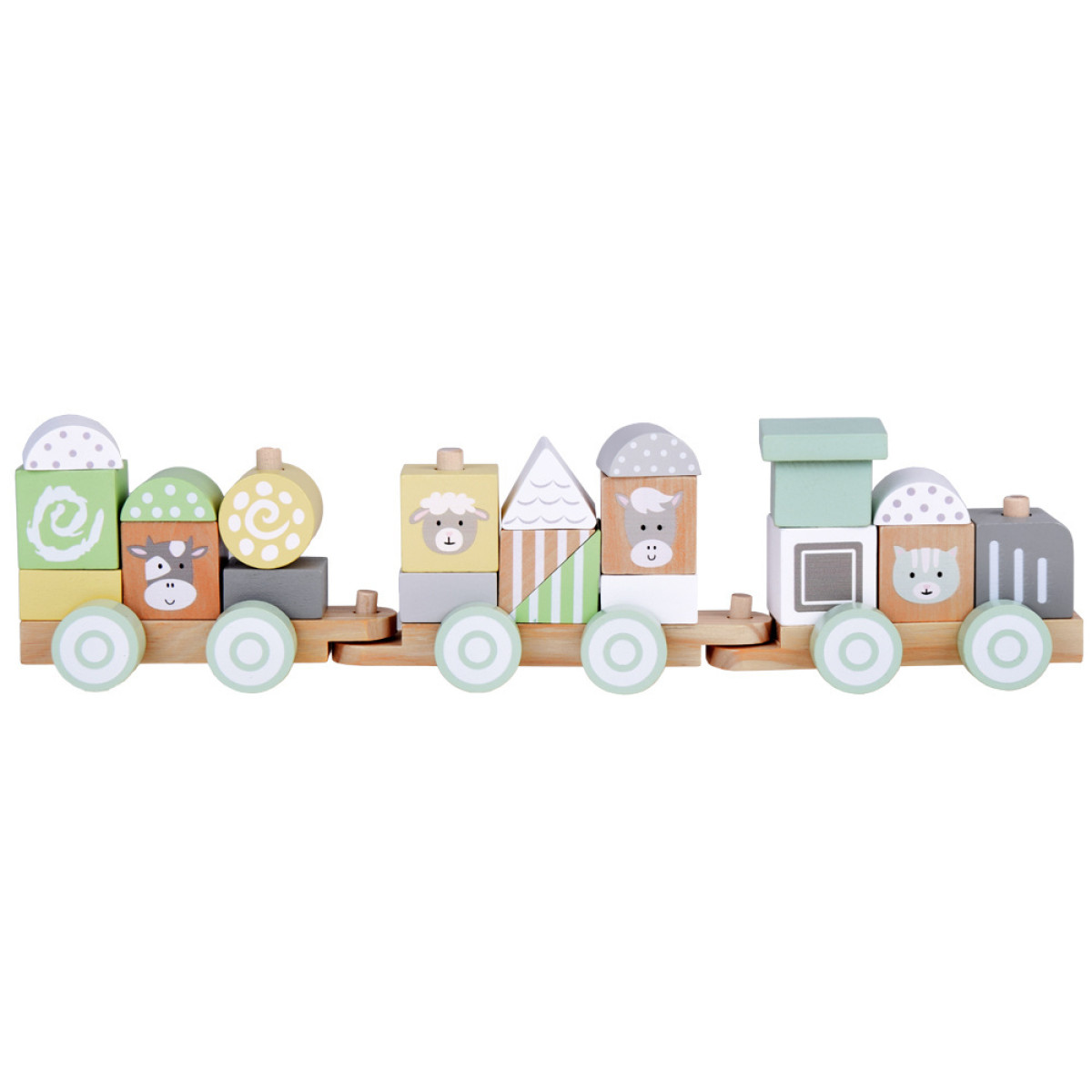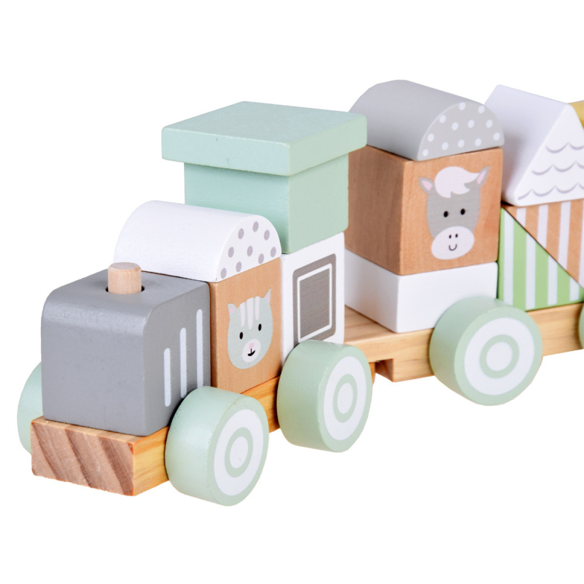 Iga vagun on kindlalt valmistatud vastupidavast puidust ja ühendub kergesti, luues pika rongikoosseisu, mida lapsed saavad mööda põrandat liigutada. Pastelne, rahulik värvigamma annab mänguasjale ainulaadse võlu ja sobib suurepäraselt igasse lastetuppa.