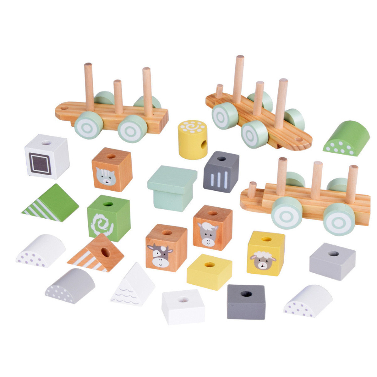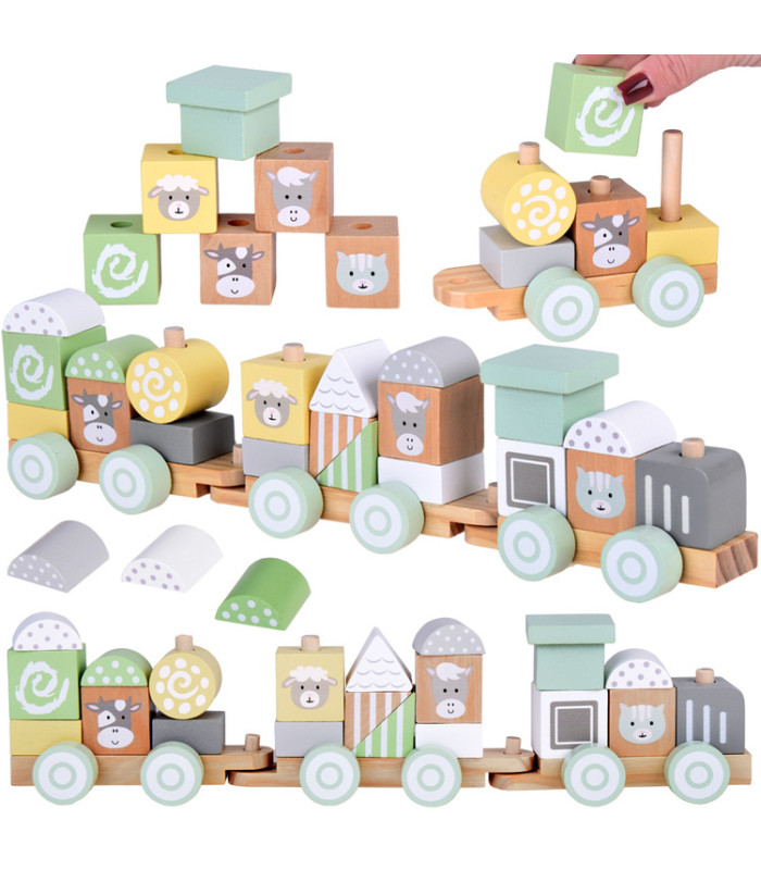 See suurepärane mänguasi lastele koosneb 23 elemendist. Valmistatud ohututest, looduslikest materjalidest, mis on siledalt lihvitud ja kaetud mittetoksiliste värvidega, tagades kõrgeima turvalisuse standardi. Komplekt sisaldab kolm liikuvat vagunit, mida saab vabalt ühendada ja lahti võtta, ning mitmekesised klotsid igas vagunis võimaldavad loovat mängu.