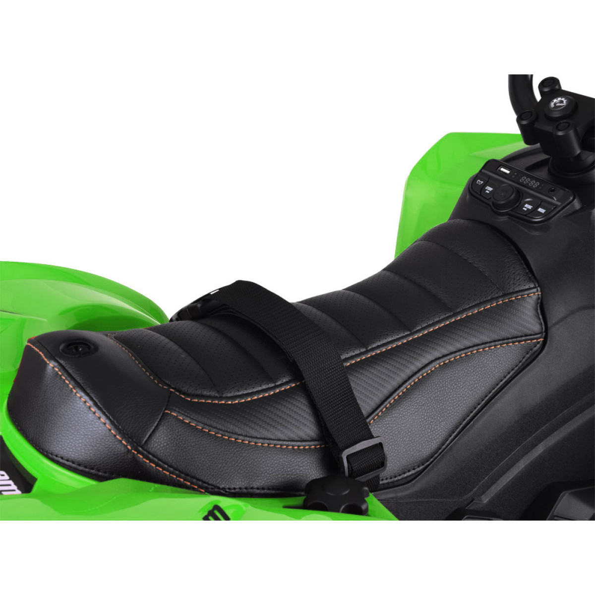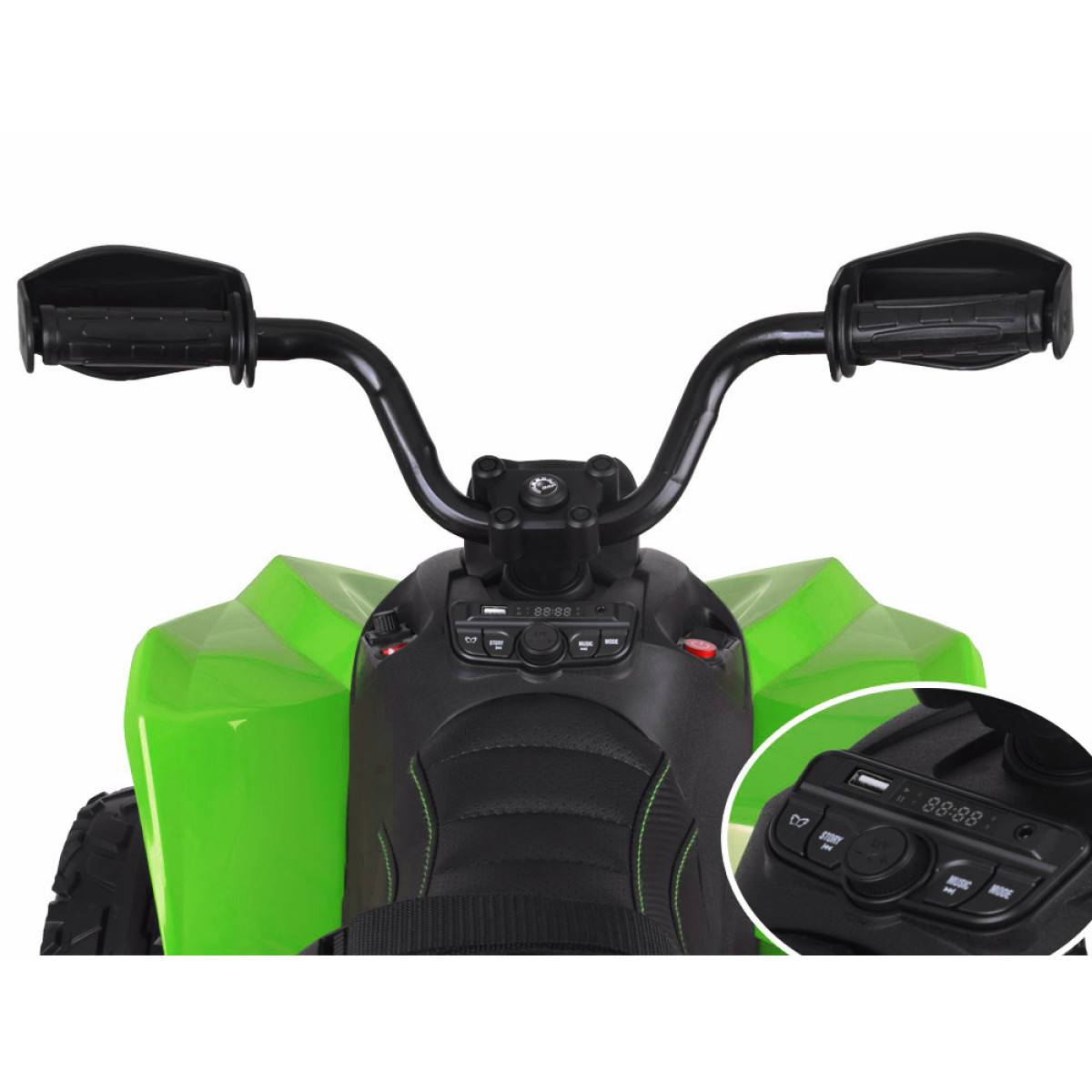 Armatuurlaual asub lüliti edasi, stop, tagurpidi sõitmiseks ning valgustuse sisse- ja väljalülitamiseks. Quadil on muusikamoodul eelinstallitud meloodiatega, USB- ja MP3-sisendiga ning FM-raadio. Quadil on suured EVA vahust rattad, tagasilla amortisaatorid ning lai mugav kunstnahaga kaetud turvavöödega iste, mis muudab sõidu veelgi mugavamaks. Quad on valmistatud kõrgekvaliteedilisest plastikust, tagades pika kasutusea noorele kasutajale. Detailide hoolikas viimistlus teeb sõiduki tõeliselt fantastiliseks. Sõitmine sellise quadiga on puhas nauding!