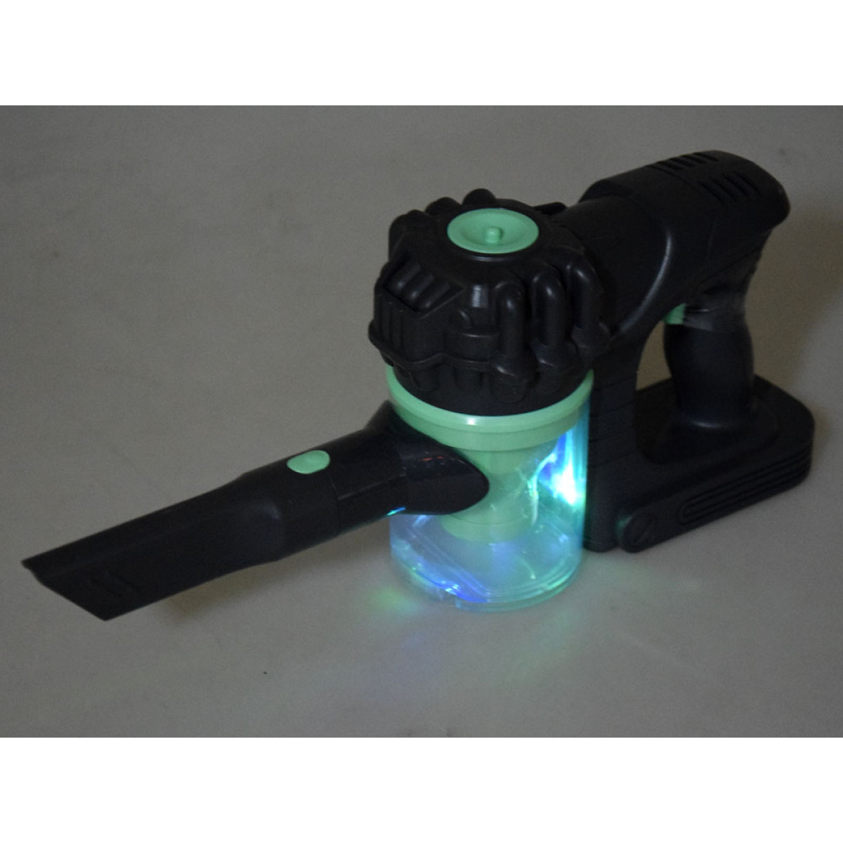 Komplekt on valmistatud elegantses hall-rohelises värvitoonis plastikust. Mänguasi sisaldab kahte vahetatavat otsikut ning töö ajal süttib värviline tuli.