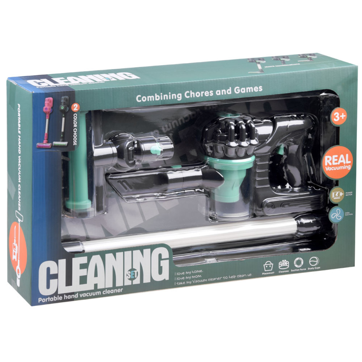 Akutoitel mänguasi teeb tolmuimemise heli ja valgusefekti. Komplekt on pakitud ilusasse värvilisse kasti, mis sobib ideaalselt kingituseks.