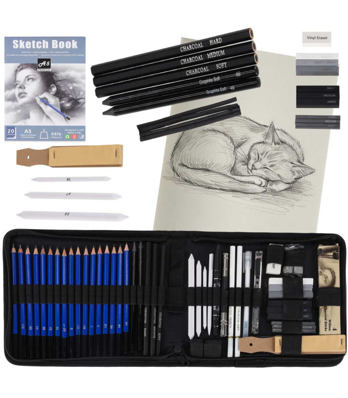 - Materjalid: grafiit ja süsi saadaval nii pliiatsite kui ka pulkadena.