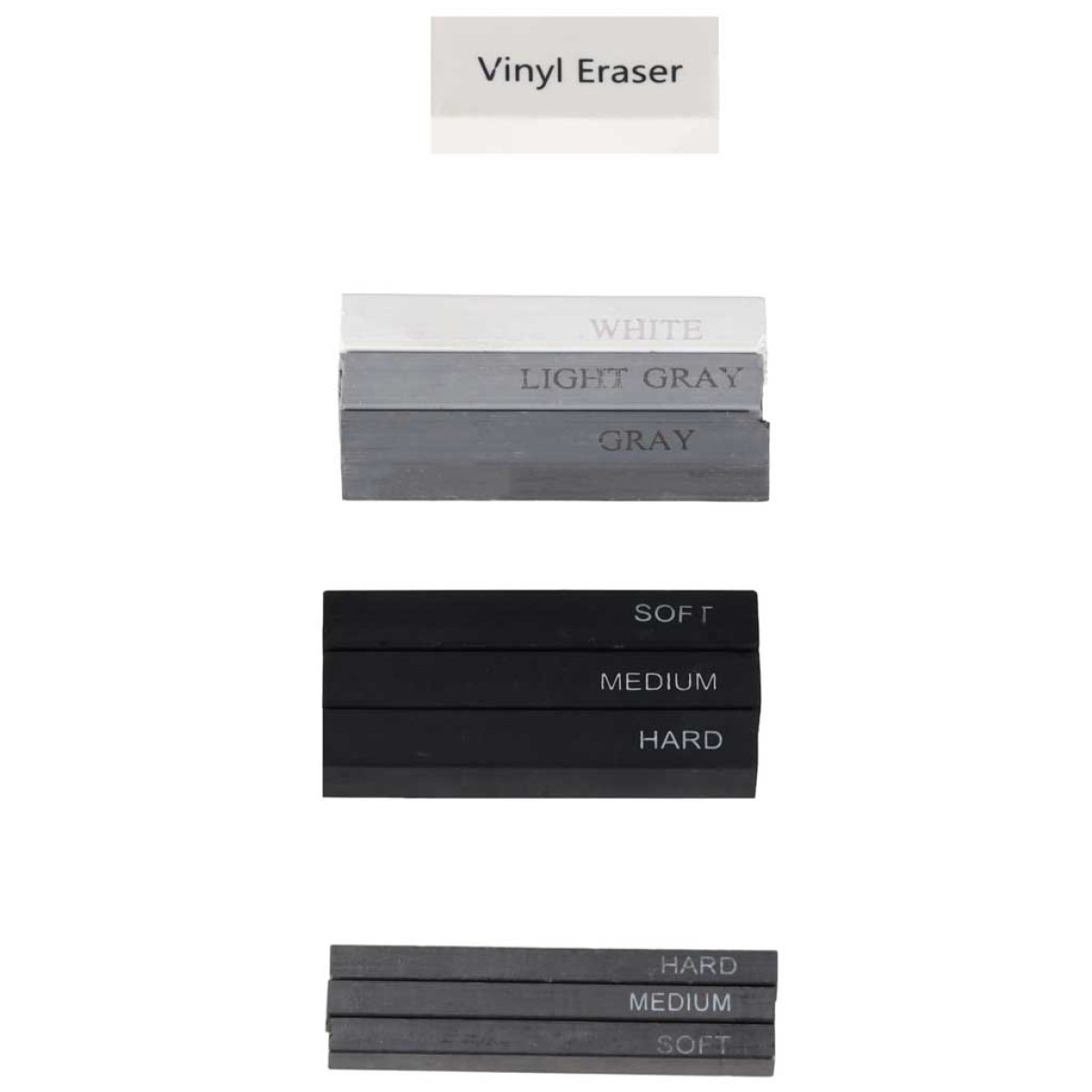 - Süsi pulgad (3 valget, heledat ja tumedat halli, 3 musta – pehme, keskmine ja kõva)