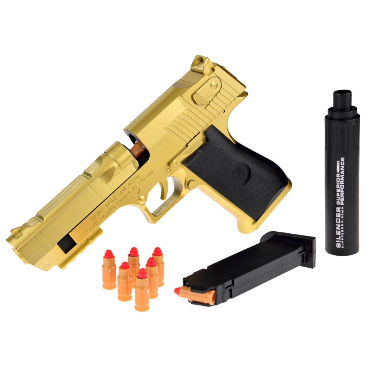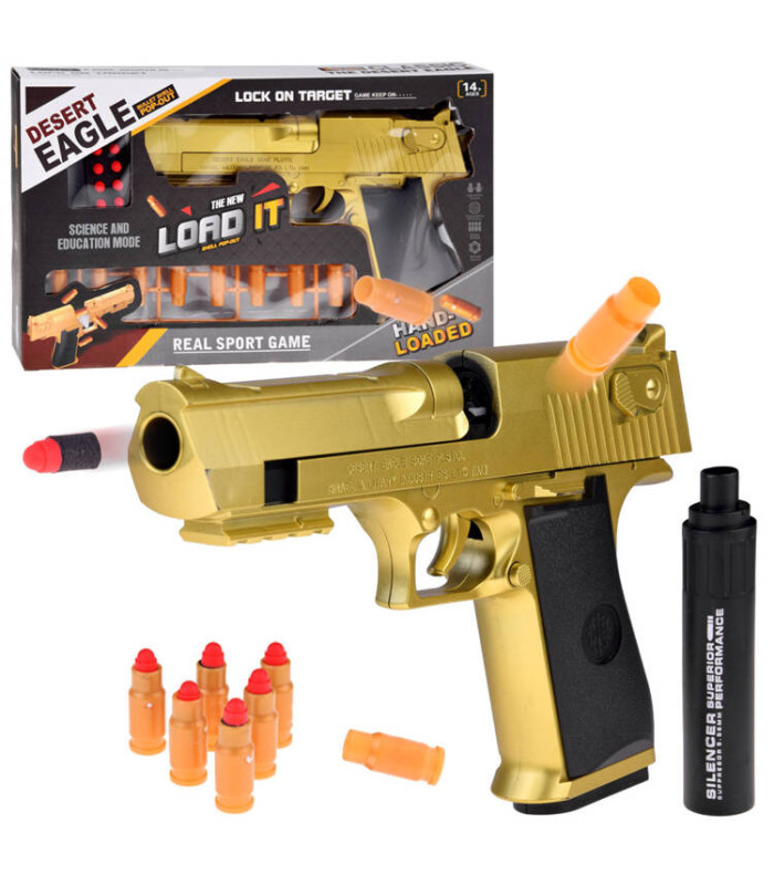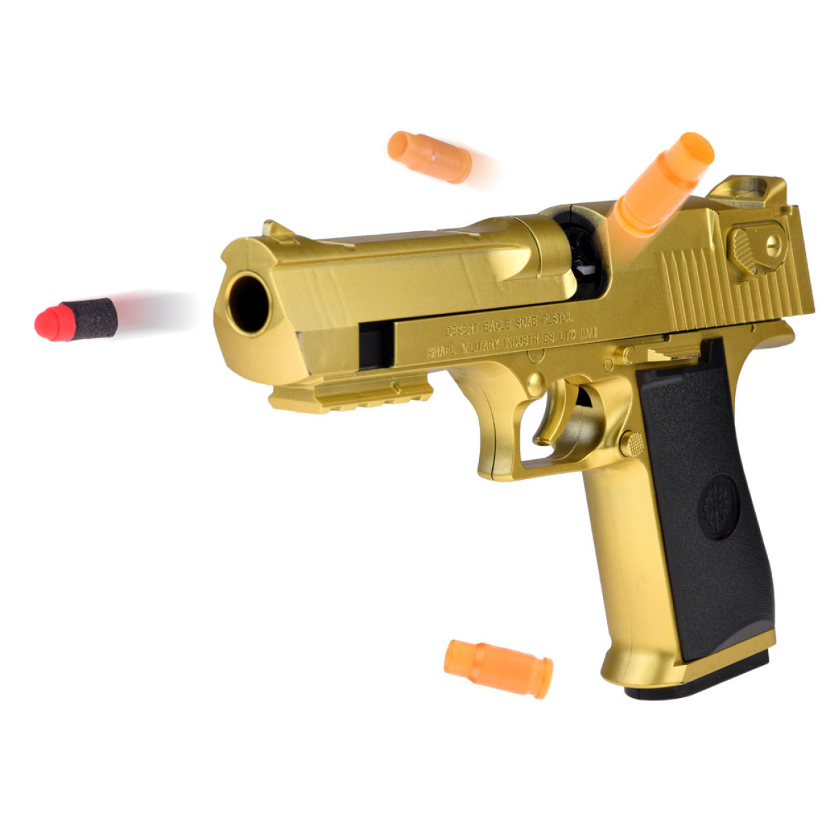 Realistliku välimusega püstol pehmete vahtkuulidega köidab kindlasti nii väikeste kui ka suurte tähelepanu. Kes ei armastaks laskemängusid? Sellise püstoliga saate tunda end nagu Ameerika filmis. Püstol on varustatud summutiga, mis muudab mängu atraktiivsemaks. Lisaks visatakse laskmise ajal kestad välja, mis muudab mängu realistlikumaks. Püstoli käepidemes on salv, mis nupuvajutusega välja hüppab. Püstol on valmistatud plastikust, samas kui kuulid on pehmest vahust. Käepideme karedal pinnal püsib püstol kindlalt käes ning tänu vedrumehhanismile tuleb püstolit iga lasu järel uuesti laadida, mis muudab iga lasu läbimõeldud.