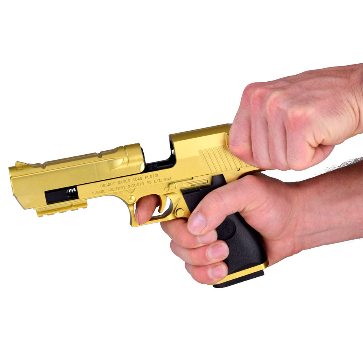 Salve laetakse kuulid, tõmmatakse lukk tagasi, vajutatakse päästikule ning sihitakse märki. Kuulid laetakse salve vedrumehhanismi abil luku tagasi tõmbamise ajal. Iga kord, kui lukk on tõmmatud, kukub kest välja. Pärast kõigi kuulide väljalaskmist salve laaditakse uuesti. Püstol tõmbab pilku. See on suurepärane mänguasi lahingumängijatele. Ideaalne kingitus väljas mängimiseks. Põnev mäng, mis haarab sind ja su sõpru täielikult.