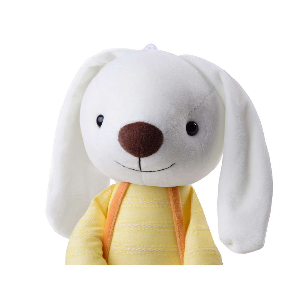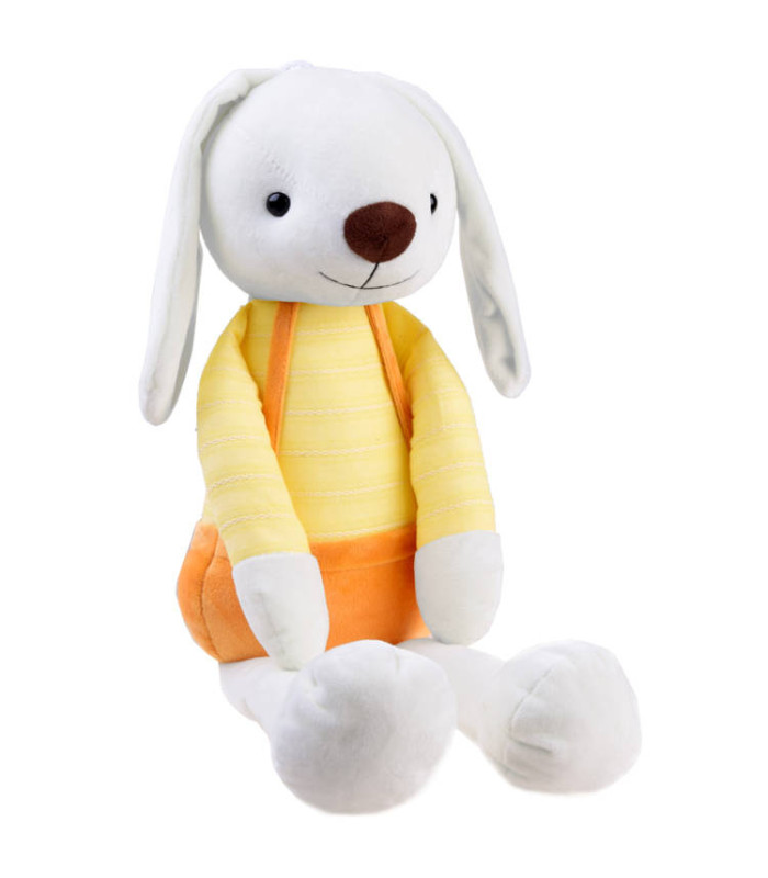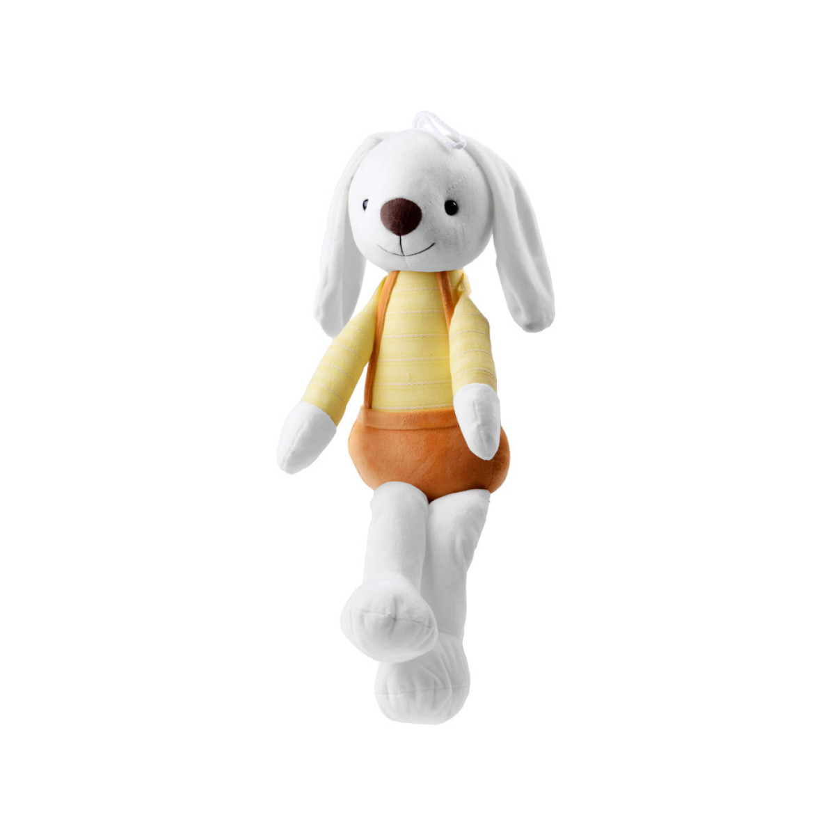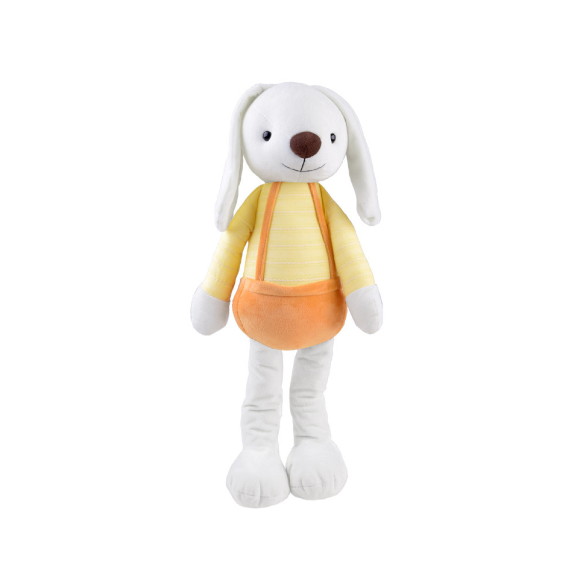 See on võluv 60 cm kõrgune pehme kootud küülik, mis on valmistatud pehmest ja meeldivast materjalist. Küülikul on plastist silmad, tikitud nina ja armas naeratus. Küülik kannab traksipükse ja triibulist pikkade varrukatega särki.