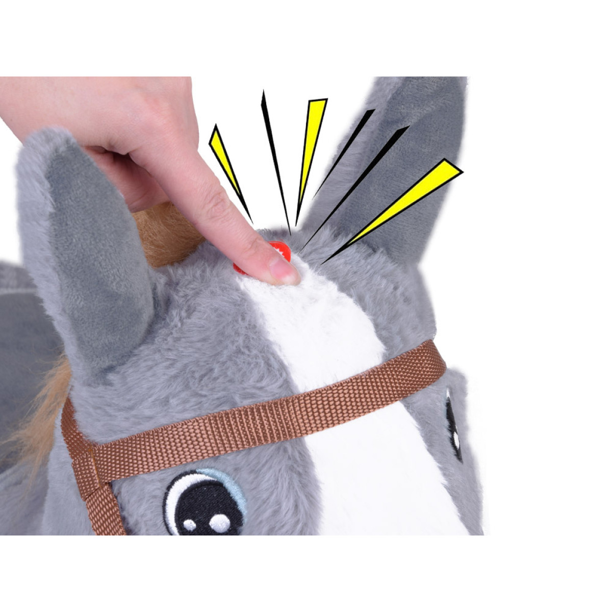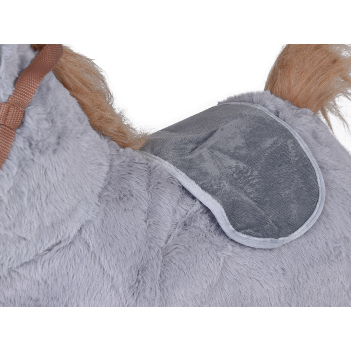 Hobune on valmistatud paksust kummist ja kaetud pehme plüüskattega. See on hoolikalt valmistatud, pöörates tähelepanu detailidele nagu tikitud silmad, rakmed ja pehme materjalist sadul. Tähelepanu köidavad ka tihe pruun lakk ja saba. Suured kõrvad, millest laps saab kinni hoida, lihtsustavad tasakaalu hoidmist "ratsutamise" ajal.