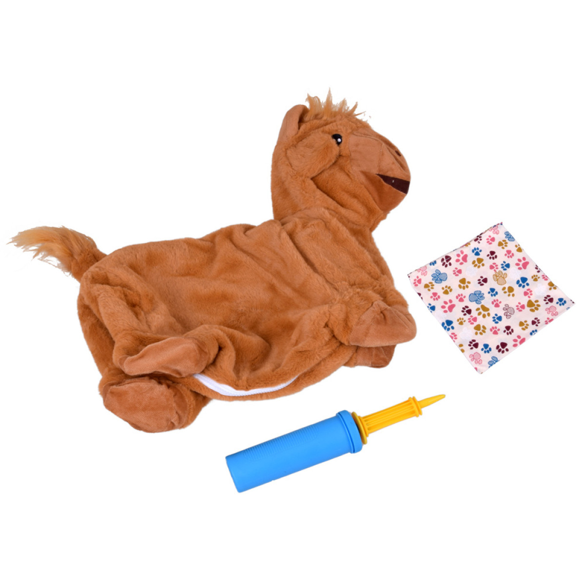 Täispuhutav, pehme ja pruun härg, millel on naeratav nägu, sarved ja saba. Lihtsalt ava lukustatav kõhuosa, tõmba välja nõel ja pumpa see meie lisatud pumbaga täis. Nüüd on härg valmis mängimiseks! Lisaks on komplektis ka kaunis kaelarätik, millel on mitmevärvilised loomakäpad, et muuta härg veelgi armsamaks.