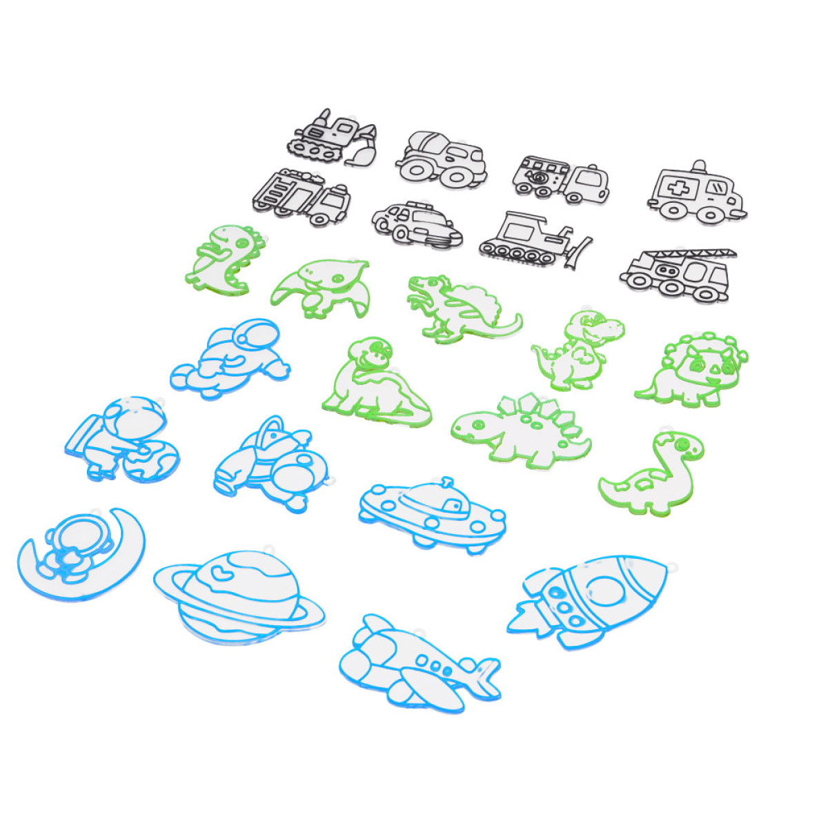Komplekt sisaldab 24 fantastilist kummist mustrit, mis kujutavad armastatud teemasid - dinosaurustest, kosmosest kuni suurte neljarattaliste masinateni. Iga muster ei ole ainult kaunistus, vaid suurepärane võimalus loominguliseks mänguks!