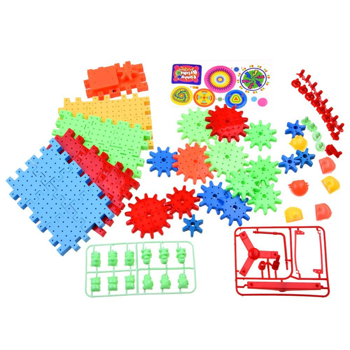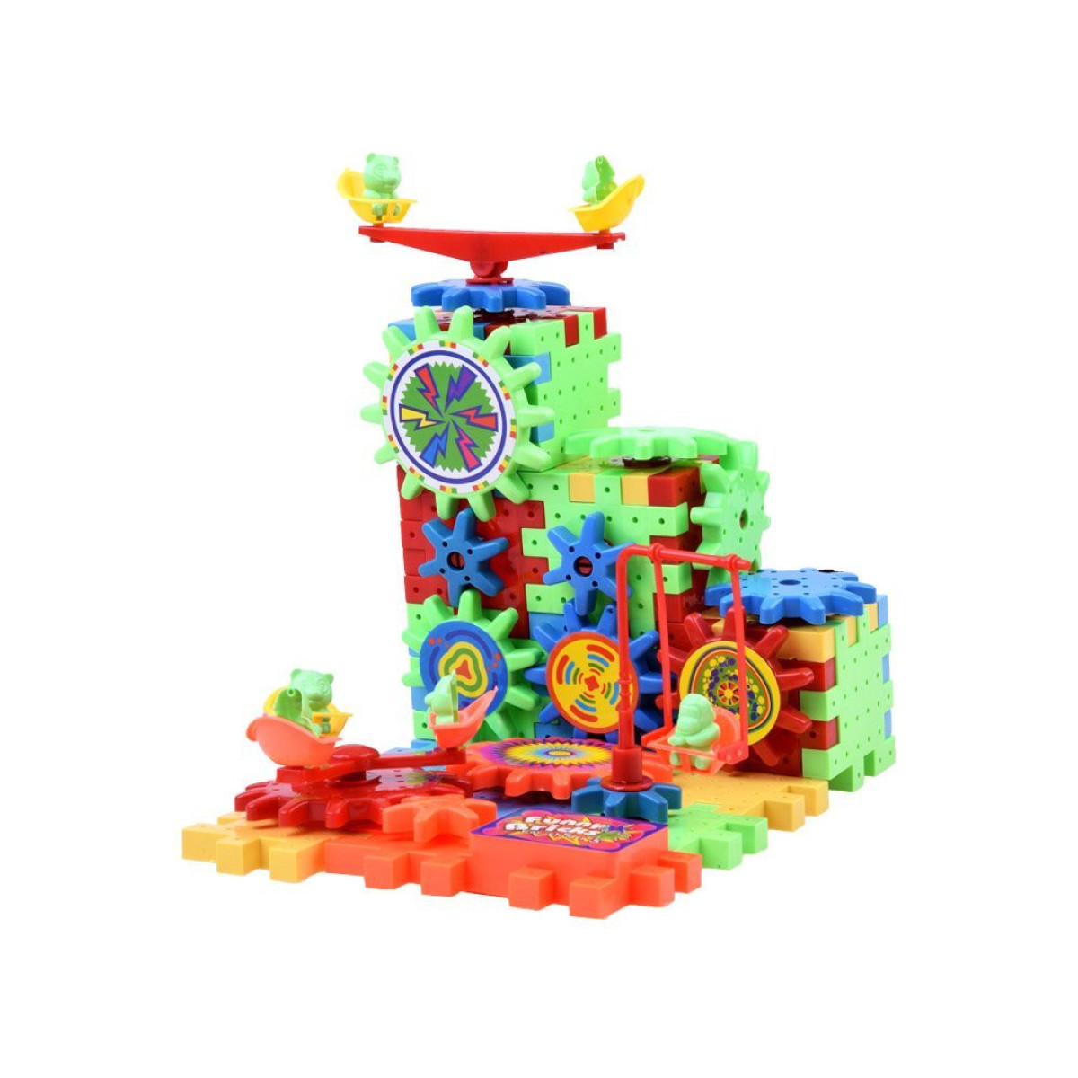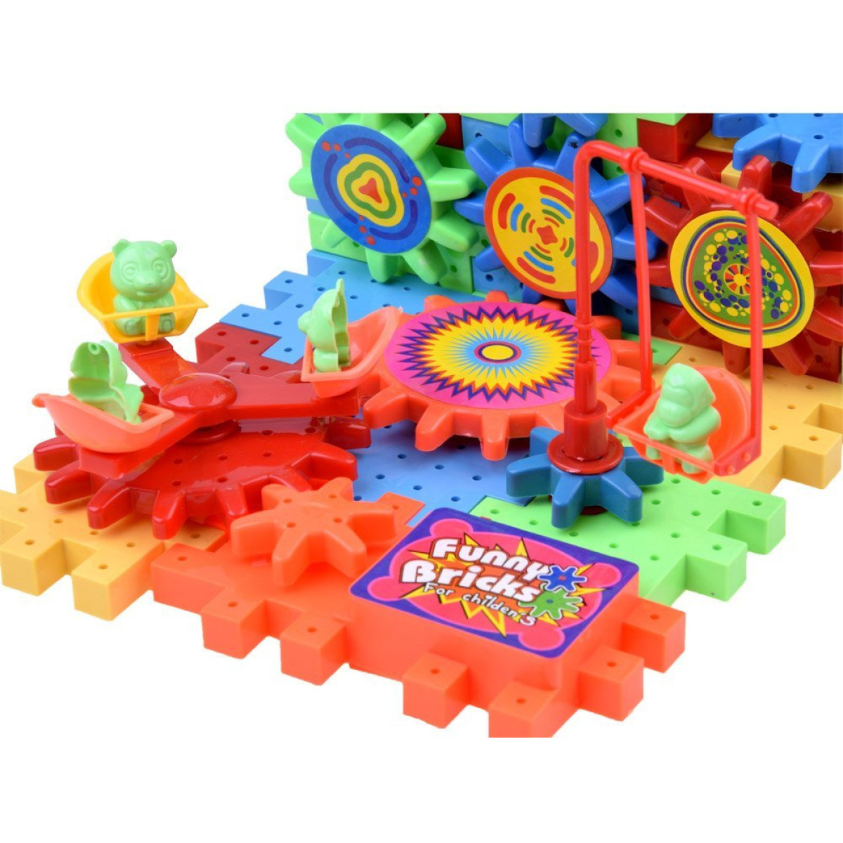 - 81 värvilist elementi, sealhulgas klotsid, hammasrattad, pusled ja loomakesed.